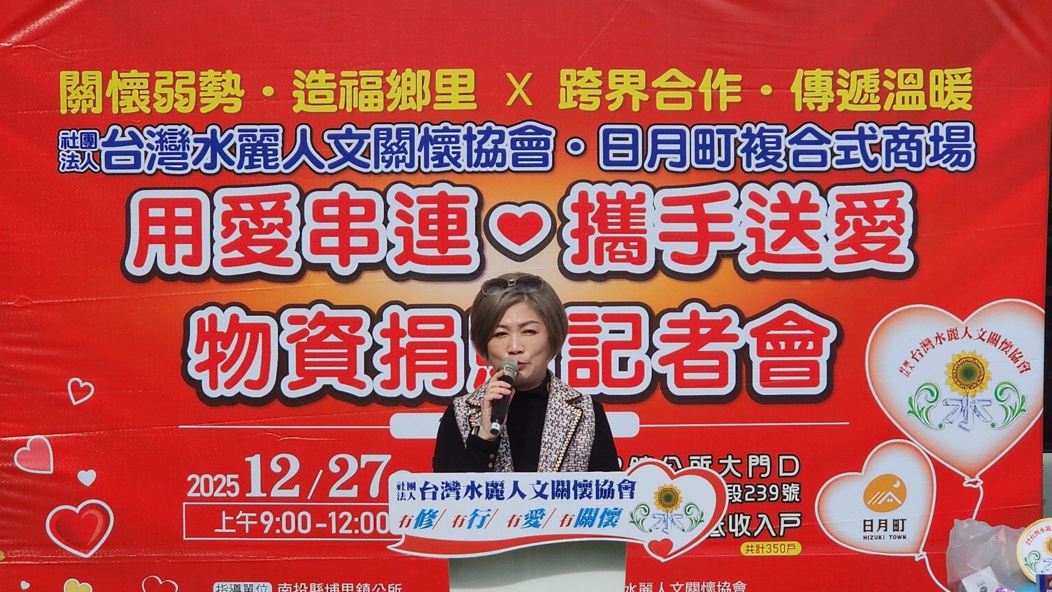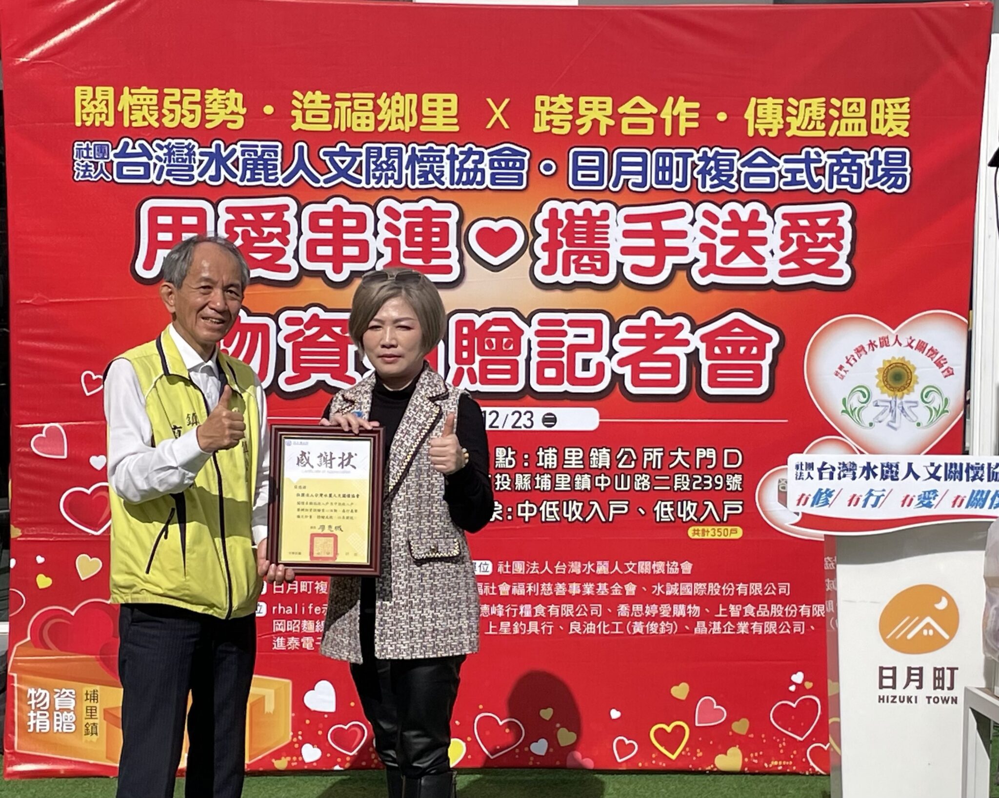 社團法人台灣水麗人文關懷協會等社團共同發起並結合南投縣埔里鎮公所舉辦「用愛串聯 攜手送愛」活動,關懷埔里鎮低收入戶及中低收入戶,將在12月27日(週六)於鎮公所前廣場發放愛心物資,有保暖衣及多項食品、日用品。理事長蘇心慧表示,年關將近,盼物資捐贈能稍解弱勢家庭生活壓力,也為他們帶來社會的鼓勵與暖意。鎮長廖志城致贈感謝狀,並特別感謝協會首度進駐埔里獻愛心,以及所有贊助單位齊心協力,愛心才能如此豐盛。