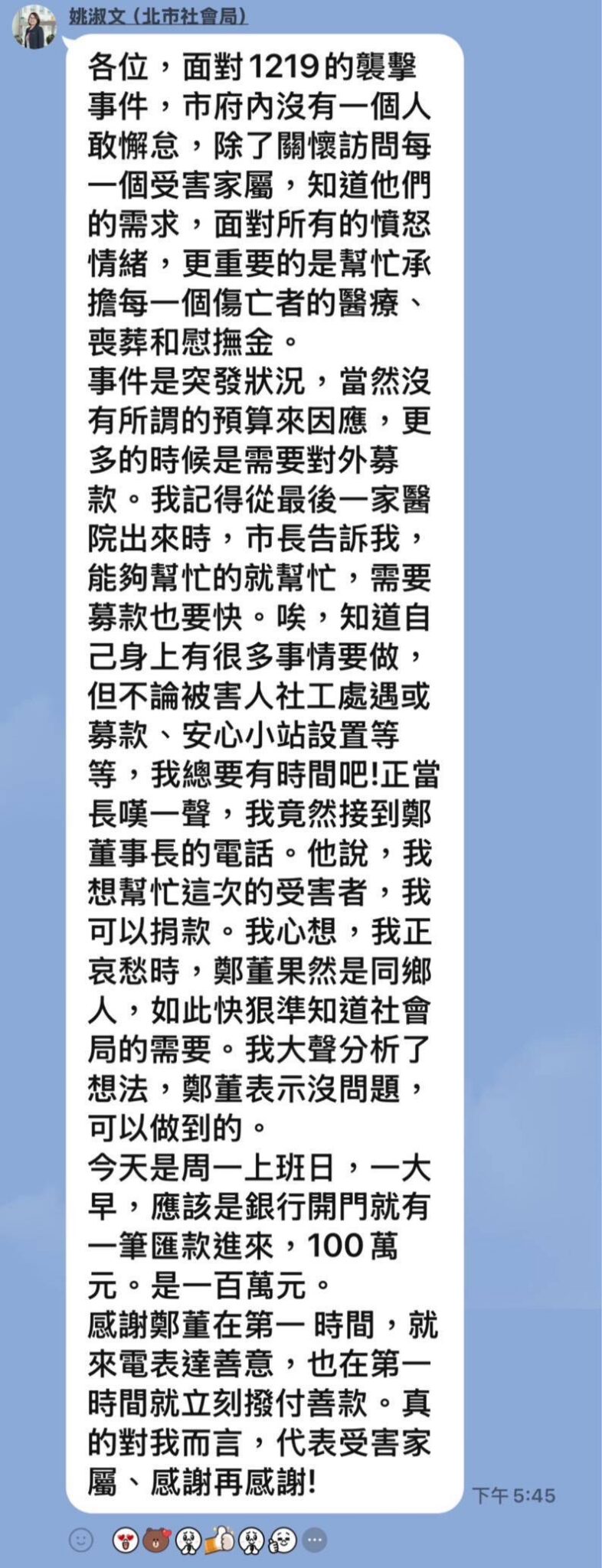 局長姚淑文在友人的line群組表示,面對1219的襲擊事件,市府沒有一個人敢懈怠,除了關懷訪問每一個受害家屬,知道他們的需求,更重要的是幫忙承擔每一個傷亡者的醫療、喪葬和慰撫金。事件是突發狀況,沒有所謂的預算來因應,更多時候需要對外募款。她記得從最後一家醫院出來時,市長指示能夠幫忙的就幫忙,需要募款也要快。