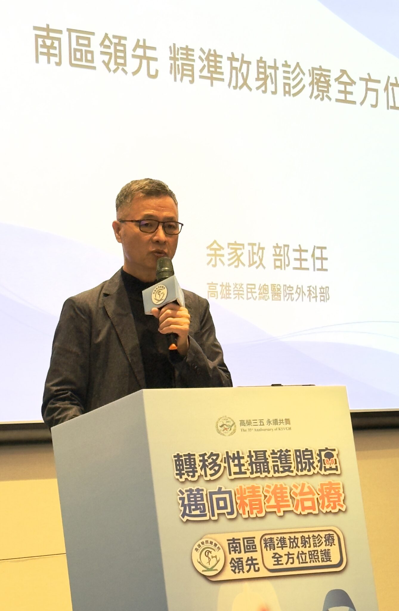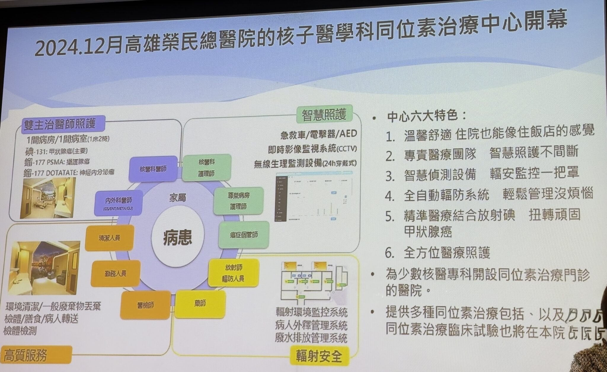 高雄榮民總醫院外科部部長余家政表示,高榮身為高屏地區公立醫學中心,配合35 週年院慶,整合多專科團隊成立「核子醫學科同位素治療中心」•提供舒適的就醫環境與智慧輻射監控系統•致力於提供南部民眾高品質的癌症醫療服務。