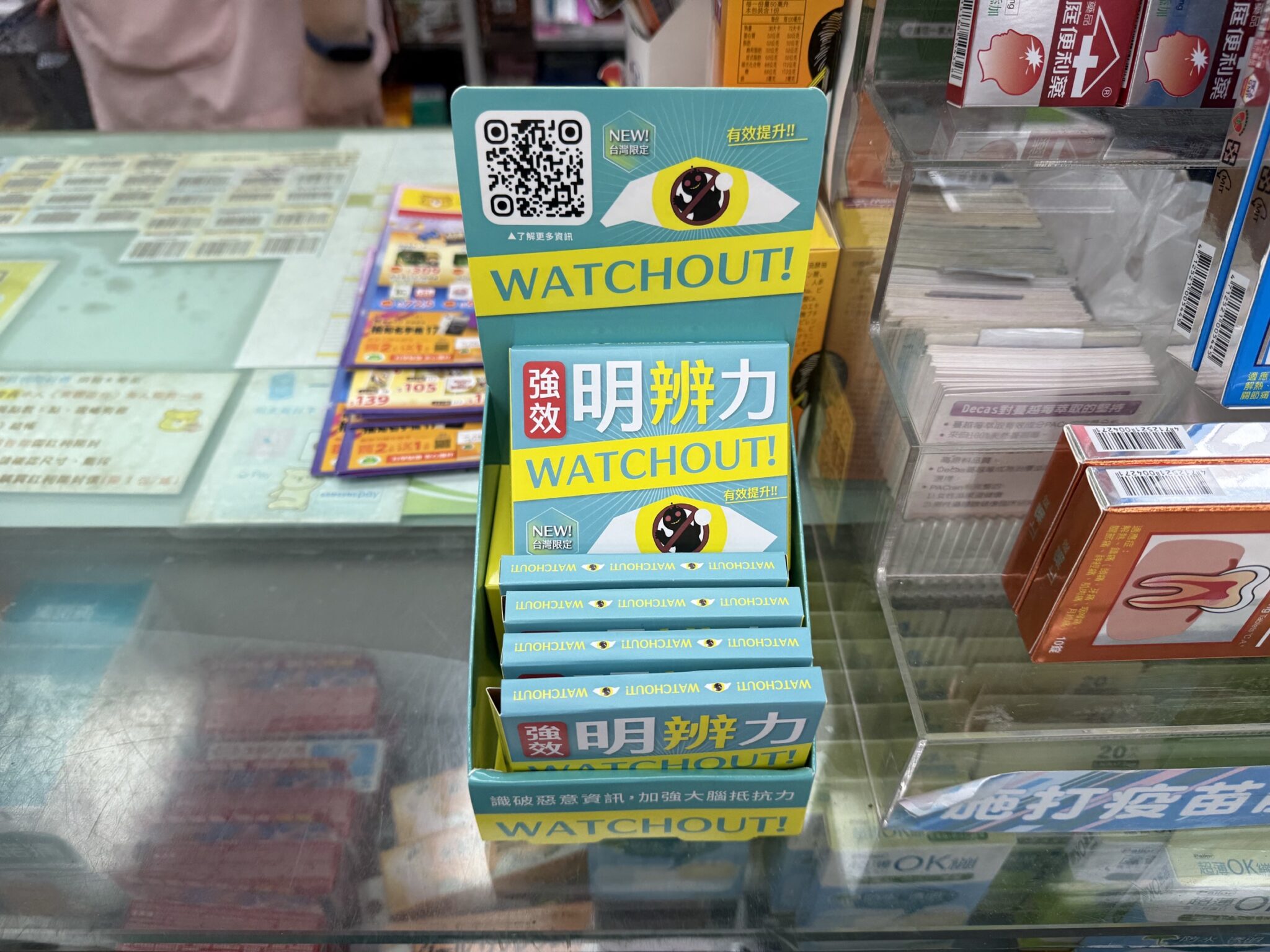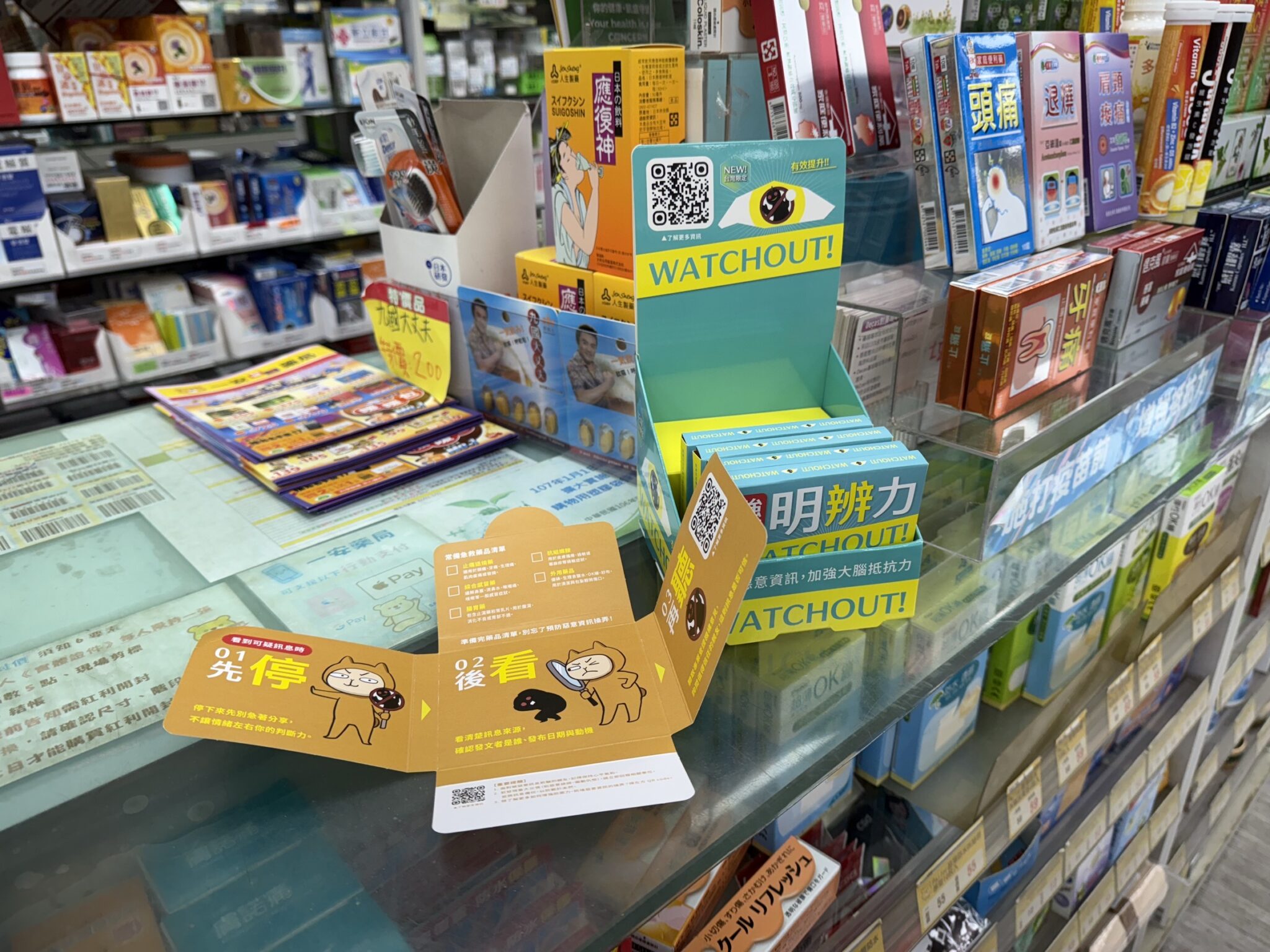 「資訊防災推廣計畫」以 Watchout 長期累積的報導內容與國際經驗為基礎,採 線上+線下整合行銷模式 推展。除了藉由實體藥袋、摺頁與展示架深化社區觸及,同時透過 QR code 延伸至線上網站,形成全方位的宣導網絡。讓資訊素養教育除了線上教材,還能實際進入你我的生活場域,在社區通路中自然形成社會防護力。