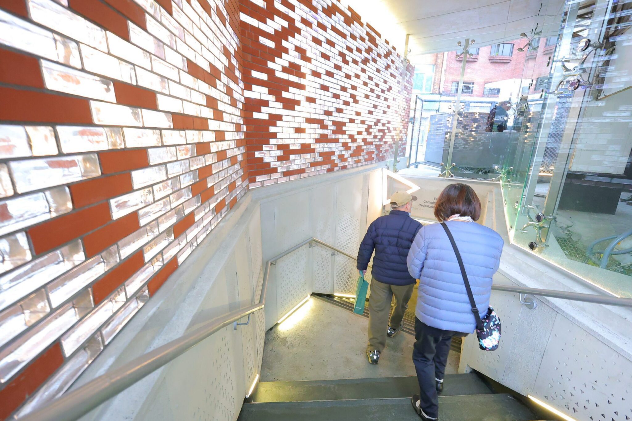 為落實與環境共好的永續價值,地下道出入口美化工程特別選用具回收價值且透光性極佳的玻璃磚,再造城隍廟人行地下道兩側出入口,除能夠在日間引入柔和的自然光源,同時亦能協助調節場域溫度,進一步提升能源使用的效益。為使街廓景觀更具一致性,緊鄰地下道出入口的銀行所在地建物立面,也將以相同的設計理念進行翻新。