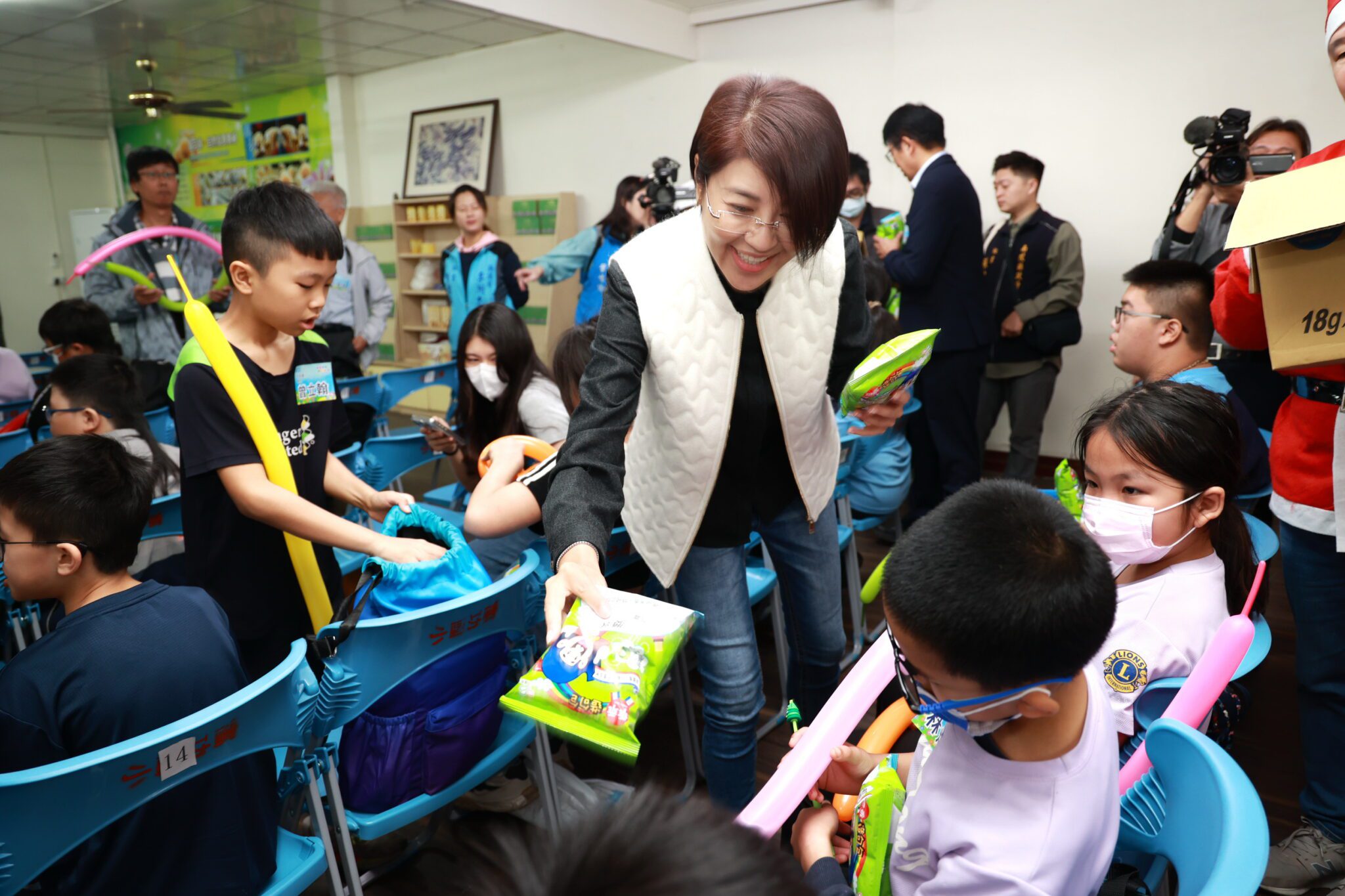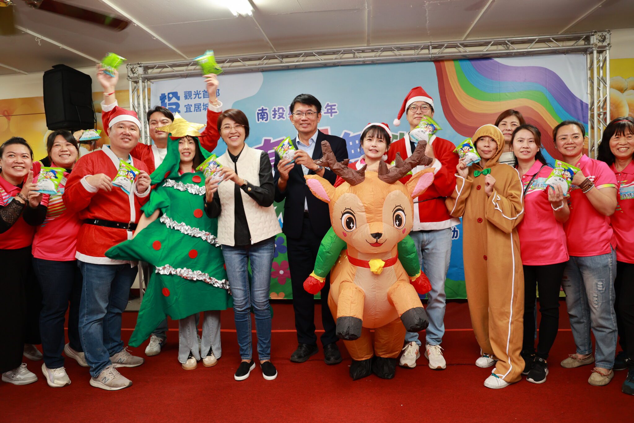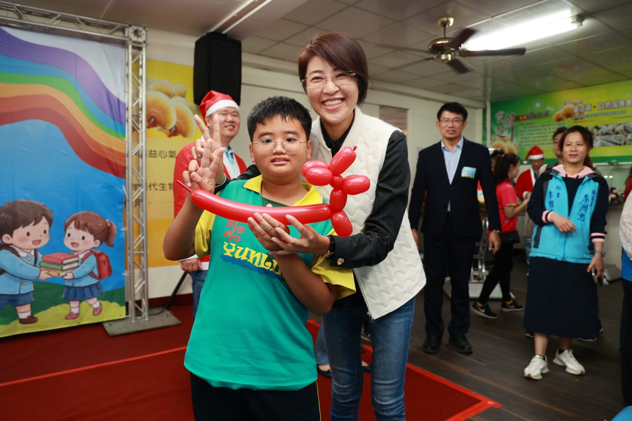 耶誕節前夕,縣府舉辦闖關活動,歡樂滿滿,氣氛十足。南投縣長許淑華不但到場和孩子們互動,還送上乖乖當禮物,大人、小孩通通有,一位同學回贈「造型汽球」,禮尚往來,現場笑開懷。