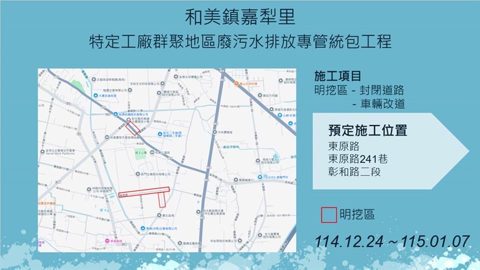 彰化縣政府水利資源處於彰化市茄苳里及和美鎮嘉犁里進行特定工廠污水排放專管建設工程,於114年 12月24日至115年1月7日預定施工範圍及管線施工路段,如圖示,工程採分段分區方式施工,相關期程將視現場施工情形調整,部分路段實施車道分流及縮減,敬請多加小心!