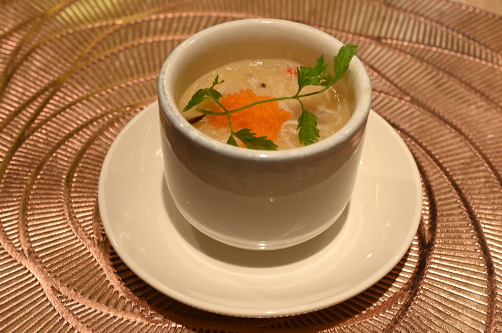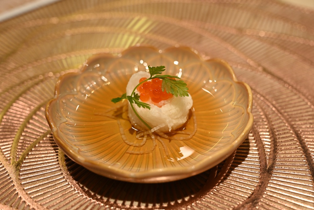 開胃前菜採用山藥細麵,淋上清爽的和風醬油,最後上面加上鮮美的鮭魚卵,口感細膩、清爽又開胃。