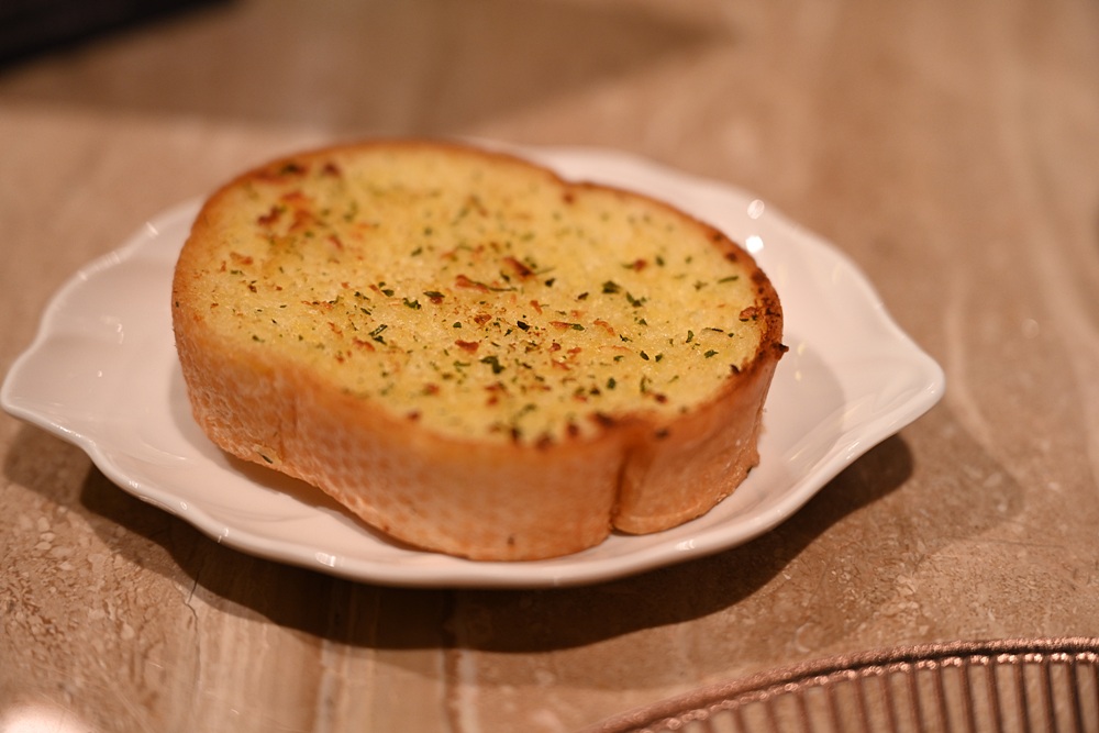 金黃酥脆蒜香麵包香氣隨著熱氣四溢,令人食指大動。