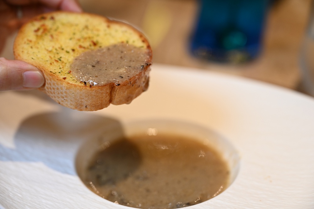 蒜香麵包沾著菌菇濃湯一起享用,麵包吸滿菌菇湯汁,滋味更加層次豐富。