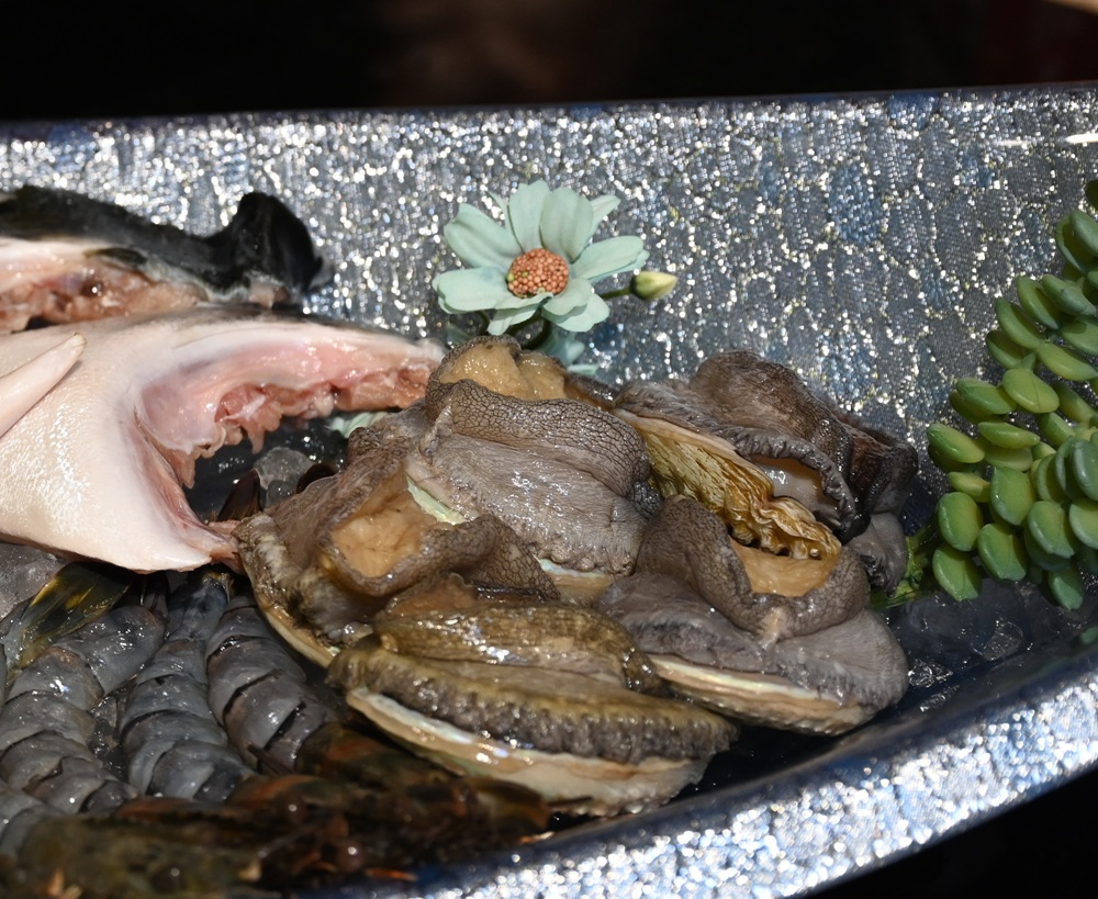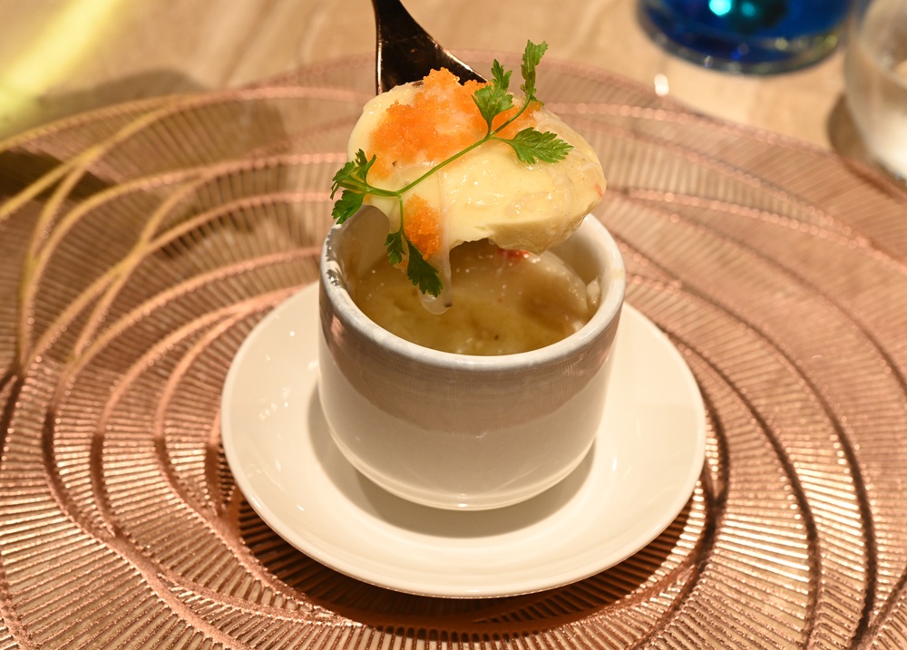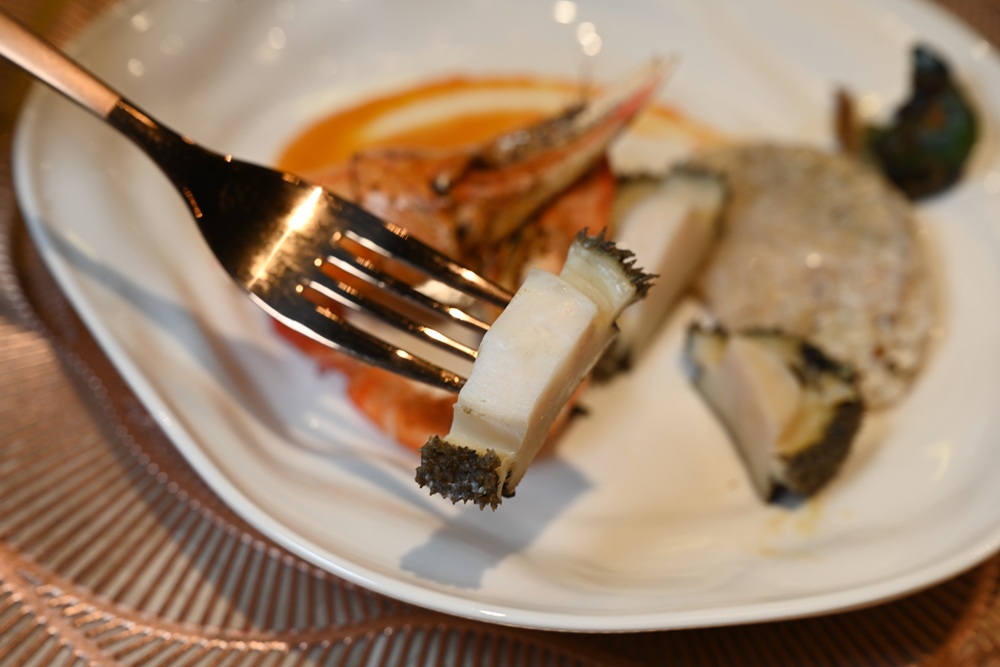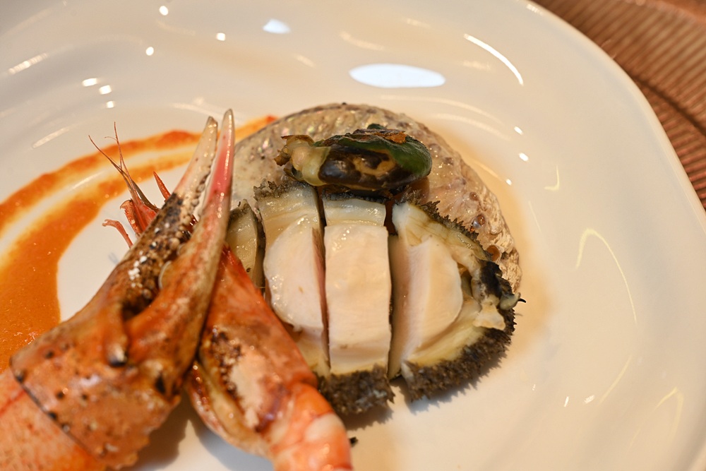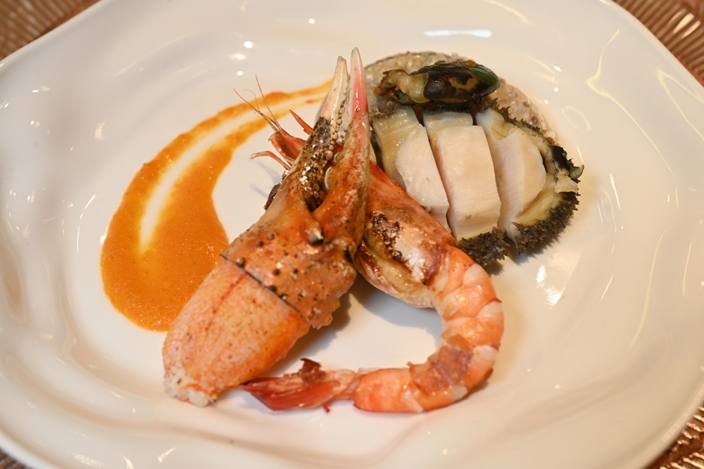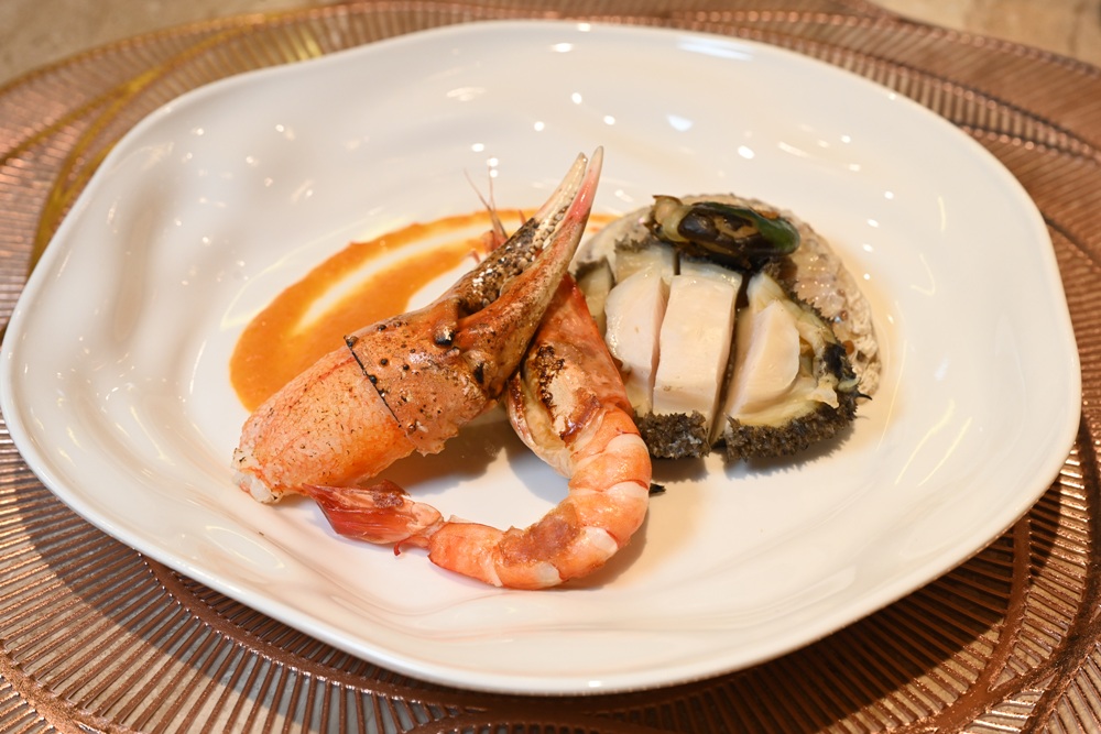 南非活鮑魚口感爽脆、鮮甜彈牙,搭配海膽、魚卵、紅蘿蔔與蛤蜊高湯熬煮而成的醬汁,海味濃郁又不搶味,更襯托出鮑魚的鮮美。另外還有日本松葉蟹蟹鉗、馬來西亞草蝦,每一口都香嫩鮮甜,層次豐富,滿滿海味在口中綻放,喜歡海鮮的朋友千萬別錯過這頂級的美味。