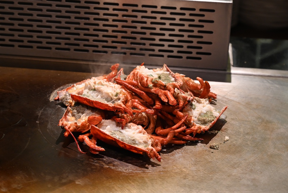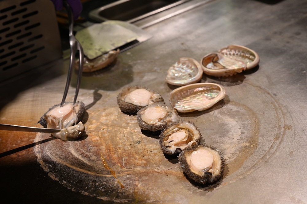 這道海鮮拼盤是點$1,890套餐才有的!海鮮拼盤嚴選來自南非活鮑魚、日本松葉蟹蟹鉗跟馬來西亞草蝦,超豐盛又美味,特別是南非活鮑魚,剛上鐵板時還會蠕動呢。