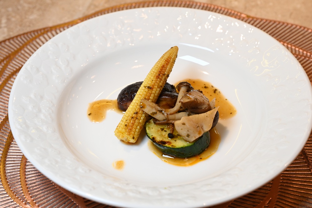 這一道時令食蔬以鐵板來料理,保留蔬菜的清甜與口感,最後淋上 主廚獨門醬汁,讓整體風味更加立體迷人。