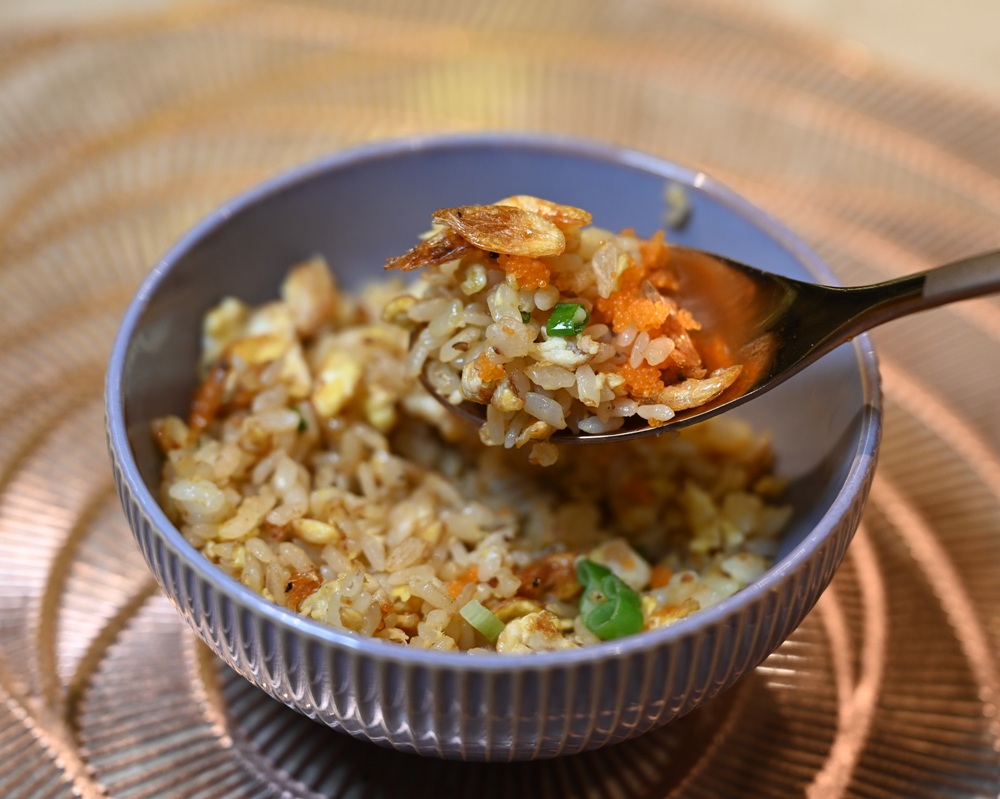 米飯炒的粒粒分明,再加上蔥花與魚卵一起拌炒,鍋香濃郁、層次分明,完美展現鐵板炒飯的精髓。
