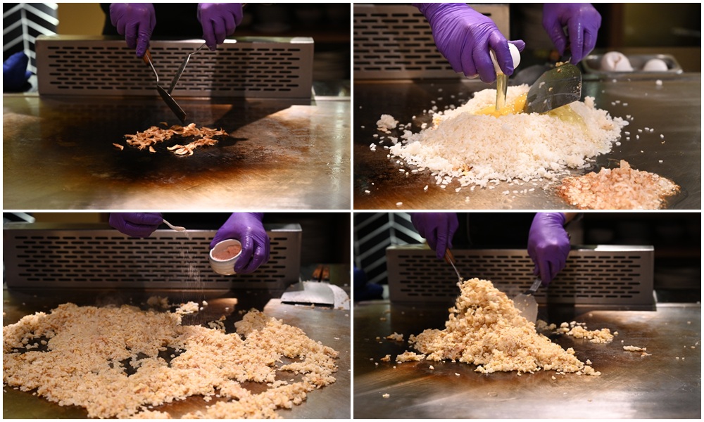 這一道鐵板炒飯也很特別,先以櫻花蝦爆香炒蛋,再加入米飯與雞蛋快炒,讓米飯融合兩種蛋香香氣,好吃極了。