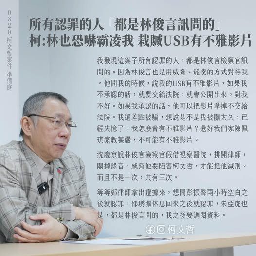 陳佩琪也再度痛批檢察官不顧柯文哲人權,鏡檢和馬檢和綠媒、名嘴們天天“偵查大公開”,陳佩琪質疑,這些外洩出去的東西,大家一看就知道絕對有人違法取得,不過都查無實證,查無不法,剩下的就衹有我們家屬被嚇到如寒蟬般不敢講話而已,“他們都自己人嘛,互相掩護一下就好了,可是我的先生卻在沒證據之下被關了一年。”