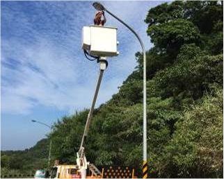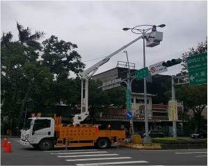 路燈工程隊隊長李七郎表示,路燈設施需升空作業的情況繁多,舉凡燈具更換及其歪斜時調正、防免燈具垂落及纜線脫落危及市民安全等,公園處的路燈維修人員定期於轄區巡檢,確保路燈狀況正常,以維護用路人之安全。工作前擺放交通錐、橫桿及告示牌,是高空作業第一步,接著管理員戴妥安全帽及安全帶後登上工作台,待一切安全措施準備就緒,駕駛再操作工作台緩緩上升。