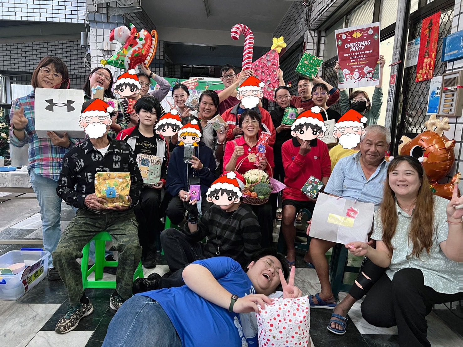 活動大合照;住民、家屬與志工齊聚一堂,在歲末聖誕時節留下溫馨合影。/ 圖 花花 攝