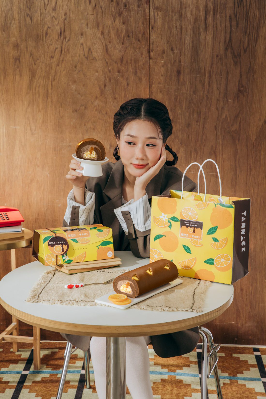 亞尼克與金針菇自創「金家ㄟ」攜手打造的濟州橘風巧克力生乳捲,將來自濟洲陽光與獨特火山土壤孕育出的金黃寶石所打造的濟州島柑橘蜂蜜茶,變成韓風生乳捲的靈魂。先以純正比利時巧克力貝可拉天然可可粉與柑橘蜂蜜茶入味泡芙蛋糕,泡芙蛋糕外皮鑲嵌西班牙橙片散發香氣,可可在橙橘烘托下更顯香醇可口。