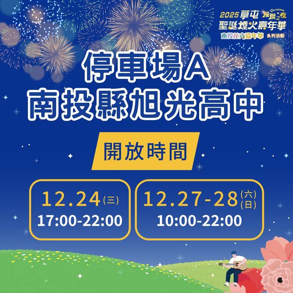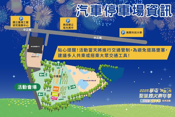 縣府觀光處指出,草屯九九峰氦氣球樂園,明年初即將試營運,縣府希望藉由2025南投花卉嘉年華首度與草屯鎮所合作辦理「草屯聖誕煙火嘉年華」先行炒熱氣氛,感謝交通部觀光署對於花卉嘉年華系列活動的支持,共同推動冬季的觀光熱潮。
