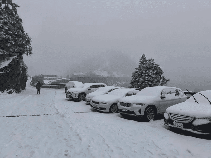 松雪樓前的車輛,都被覆蓋一層厚厚雪白的景色。(圖/林保署南投分署提供)