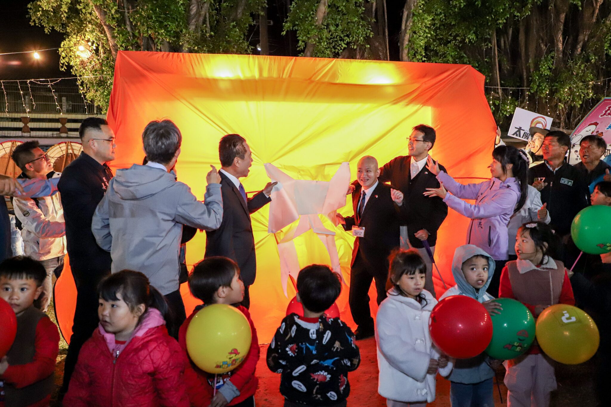 隨後翁縣長與日本外賓、美國與巴基斯坦籍外籍教師共同拆開校方布置的大型禮物「太陽之都」燈箱裝置藝術,向眾人宣傳「2026台灣燈會在嘉義」,精緻燈箱揭幕後令眾人讚嘆連連。