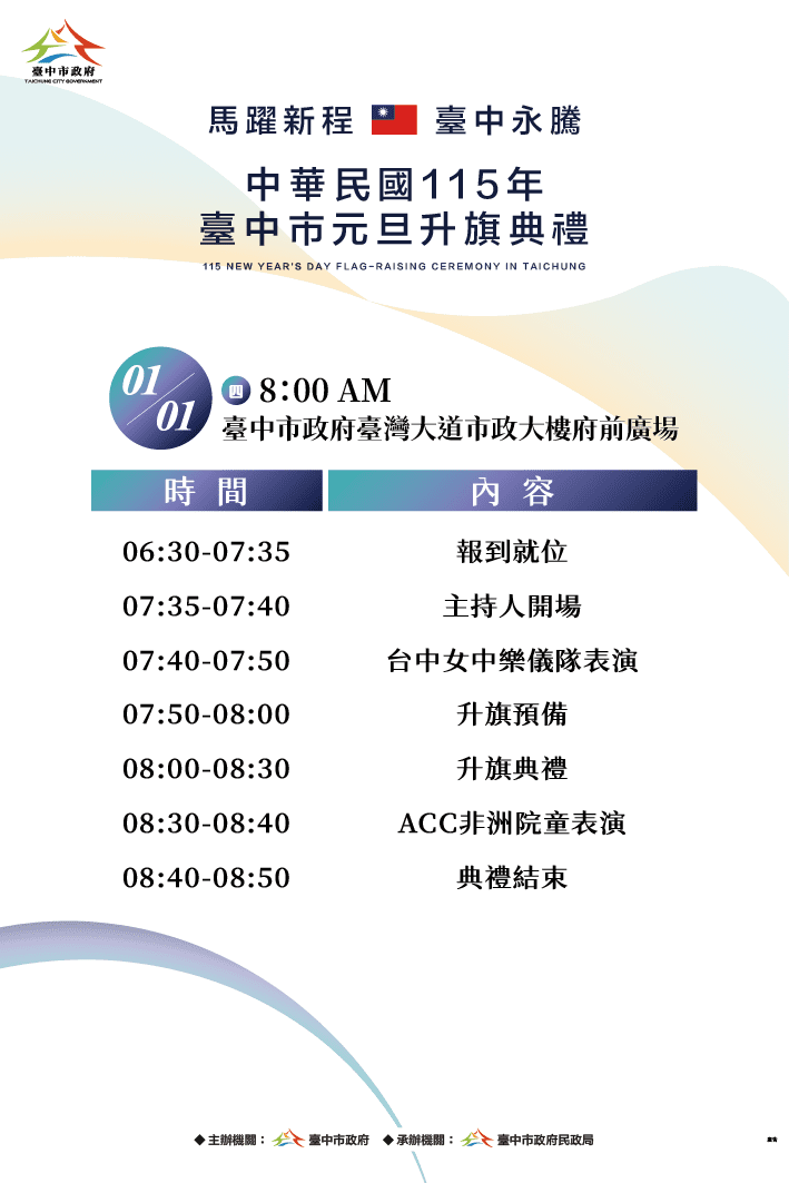 民政局提到,此次升旗典禮主視覺以「豐收迎日」為主題,象徵台中市各項市政建設歷經多年耕耘與累積,逐步展現豐碩成果,迎向充滿希望的新一年;整體設計以一條綿延且自由延展的線條貫穿畫面,象徵城市發展歷程中所面臨的挑戰與堅持,最終勾勒出壯闊山形與旭日初升的意象,傳達台中在歷經考驗後撥雲見日,邁向豐收成果與光明未來的城市精神,展現持續前行、穩健成長的城市形象。