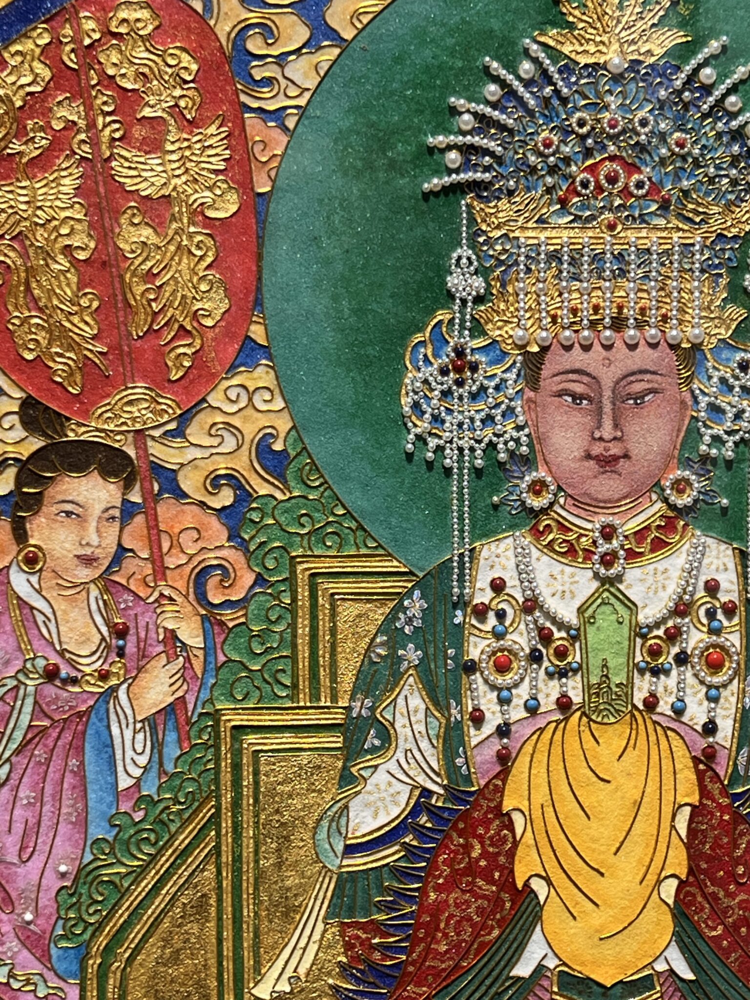 白描、比例、構圖、設色與材料的理解與運用,必須長年累積。唐卡的「像不像」不只是形似,更是比例與神韻的系統性的協調;沒有足夠訓練,很難在細節密度極高的畫面裡維持穩定。