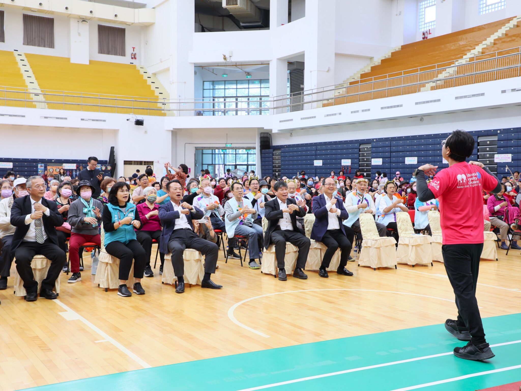 老師在舞台上帶領長輩伸展活動,接著拿出牙齒模型,教大家如何正確潔牙。縣長翁章梁擔心動作不確實,頻頻看向身邊的嘉義縣牙醫師公會理事長何展宏醫師。翁縣長還走到台下,與長輩們互動,提醒他們潔牙小知識。