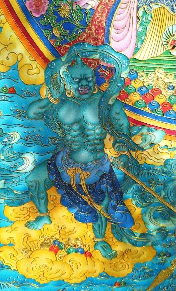 而媽祖最廣為人知的護法神將——千里眼、順風耳——在唐卡敘事中,對應的是「護法」位置:一位象徵洞察與警覺,一位象徵聽聞與守護,讓「救苦救難」不只是口號,而能在畫面下方形成穩定的守護結界。