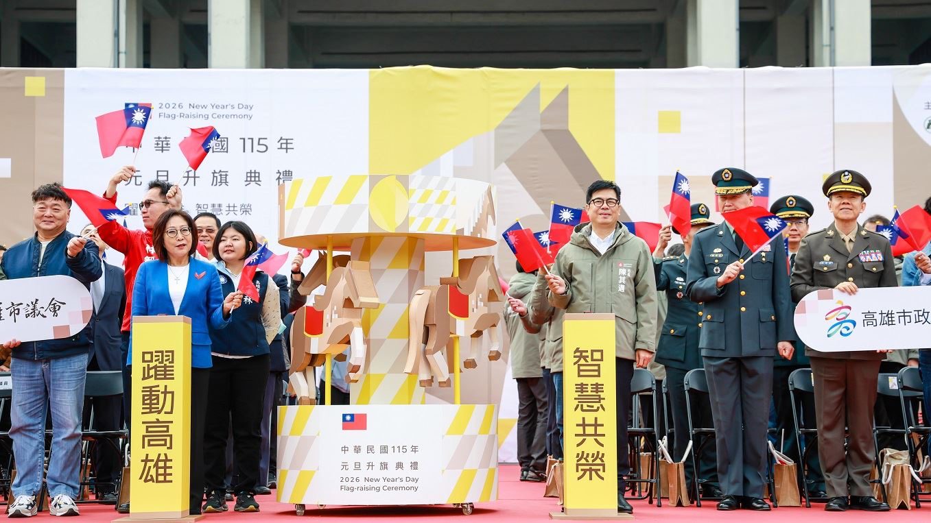 元旦升旗典禮由高雄女中樂儀隊揭開序幕,並結合國軍娃娃活力熱舞與海軍陸戰隊精湛操槍演出。圓形廣場一早就聚集許多民眾,大家齊唱國歌,迎接新年到來。市府民政局表示,今年現場循例發放的一卡通紀念卡,由插畫家馬里斯設計,以童趣的生肖馬為主要元素,搭配燦爛天空、山巒、港灣、建築等圖像,象徵夢想從海港城市啟程奔馳,迎向未來。