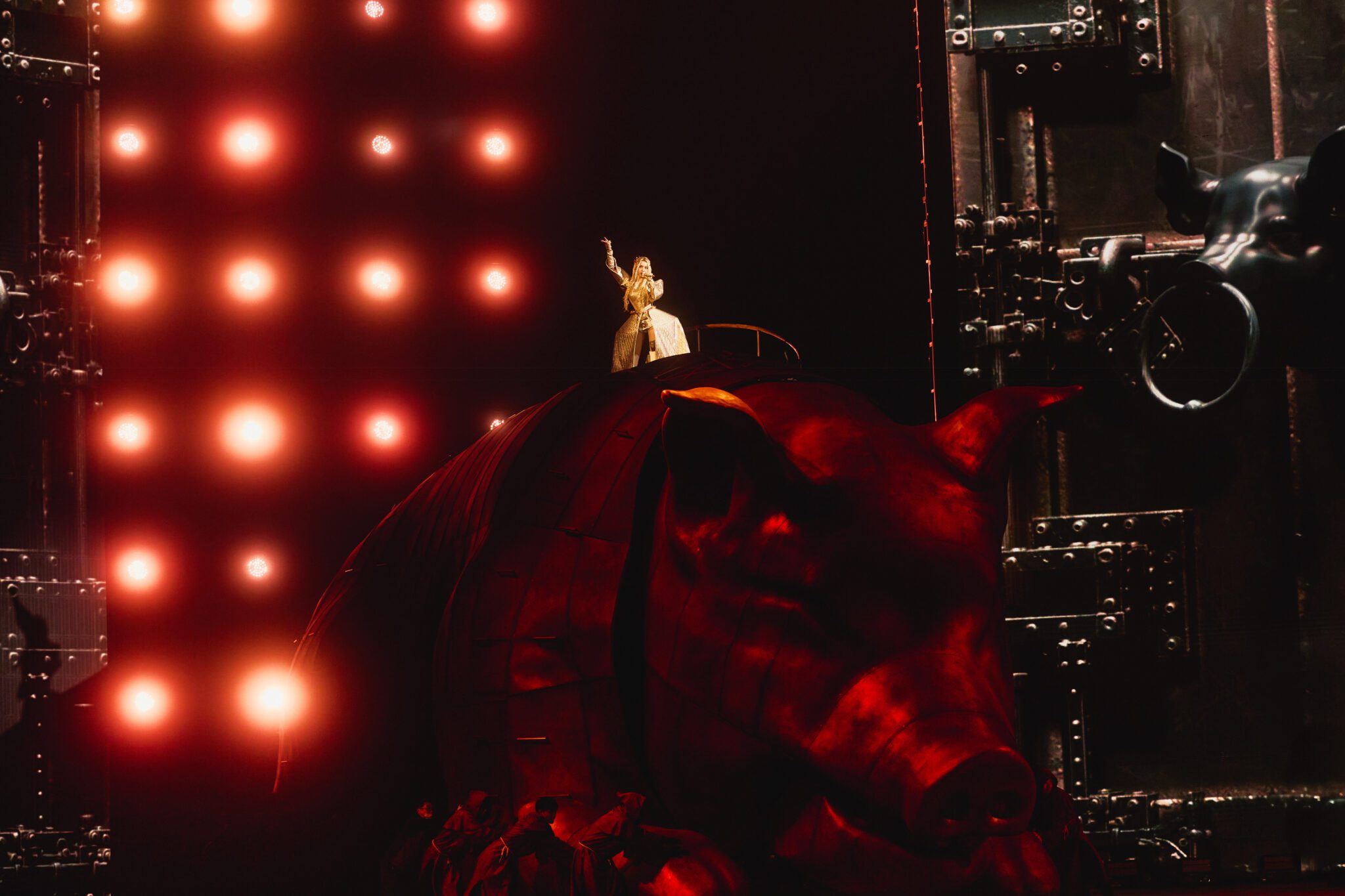 而在所有巨型道具之中,最令人難忘的莫過於第二篇章〈PLEASURE ECHOES PAIN(愉悅在苦痛中迴盪)〉中登場的「貪婪金豬」,不僅同時肩負 JOLIN 的霸氣坐騎與主舞台核心裝置,更內建讓全場歌迷嗨翻的「吐鈔機」功能,普發「愉悅紙鈔」,集視覺震撼、敘事象徵與娛樂效果於一身,可說是功能性與話題性兼具的舞台焦點。不過也正因為「一豬多用」、內部結構極為複雜,製作成本價格不斐,四噸重的豬體連同運費便高達 120 萬美金(約新台幣 3,600 萬元),且必須包下整架貨機才能完整運送來台,也因此讓工作人員趣稱它是「坐飛機來的豬」,堪稱名副其實、身價不凡的「金豬」,也再次印證 JOLIN 演唱會在製作規格與舞台美學上的極致追求。