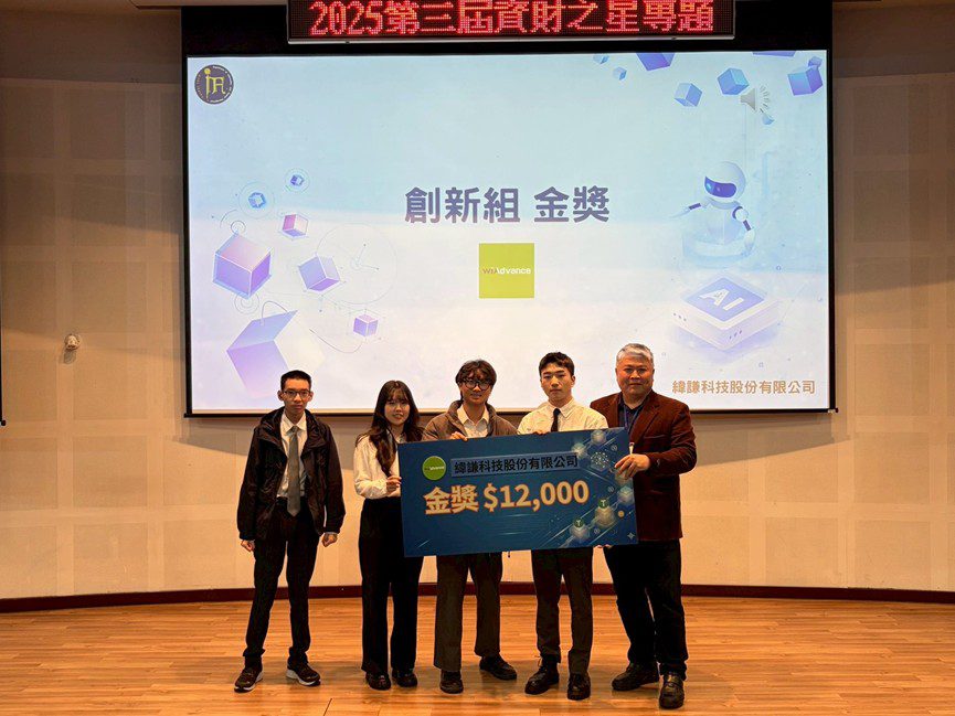 值得關注的是,第三屆「資財之星」在競賽架構與獎項設計上全面升級,總獎金高達新臺幣 10 萬元、共設 14 個獎項,並首度依據專題屬性劃分為資訊組、財務組與創新組三大競賽類別,使評選更貼近產業實務需求與學生專長。決賽結果揭曉後,由「投資智聊」團隊榮獲富邦產險資訊組金獎(圖1),「智慧保險理賠助手」團隊獲得國泰人壽財務組金獎(圖2),「PoseFit」團隊則奪下緯謙科技創新組金獎(圖3);銀獎的部分,則由SAIBOT團隊獲得「西北臺慶科技資訊組」銀獎、基於債券文本團隊獲得「上海商銀財務組」銀獎、health團隊獲得「緯謙科技創新組」銀獎。另有 8 組壁報發表團隊因研究成果表現亮眼,獲頒企業贊助之特別獎(每組 5,000 元),肯定學生將技術構想轉化為可行應用的努力。