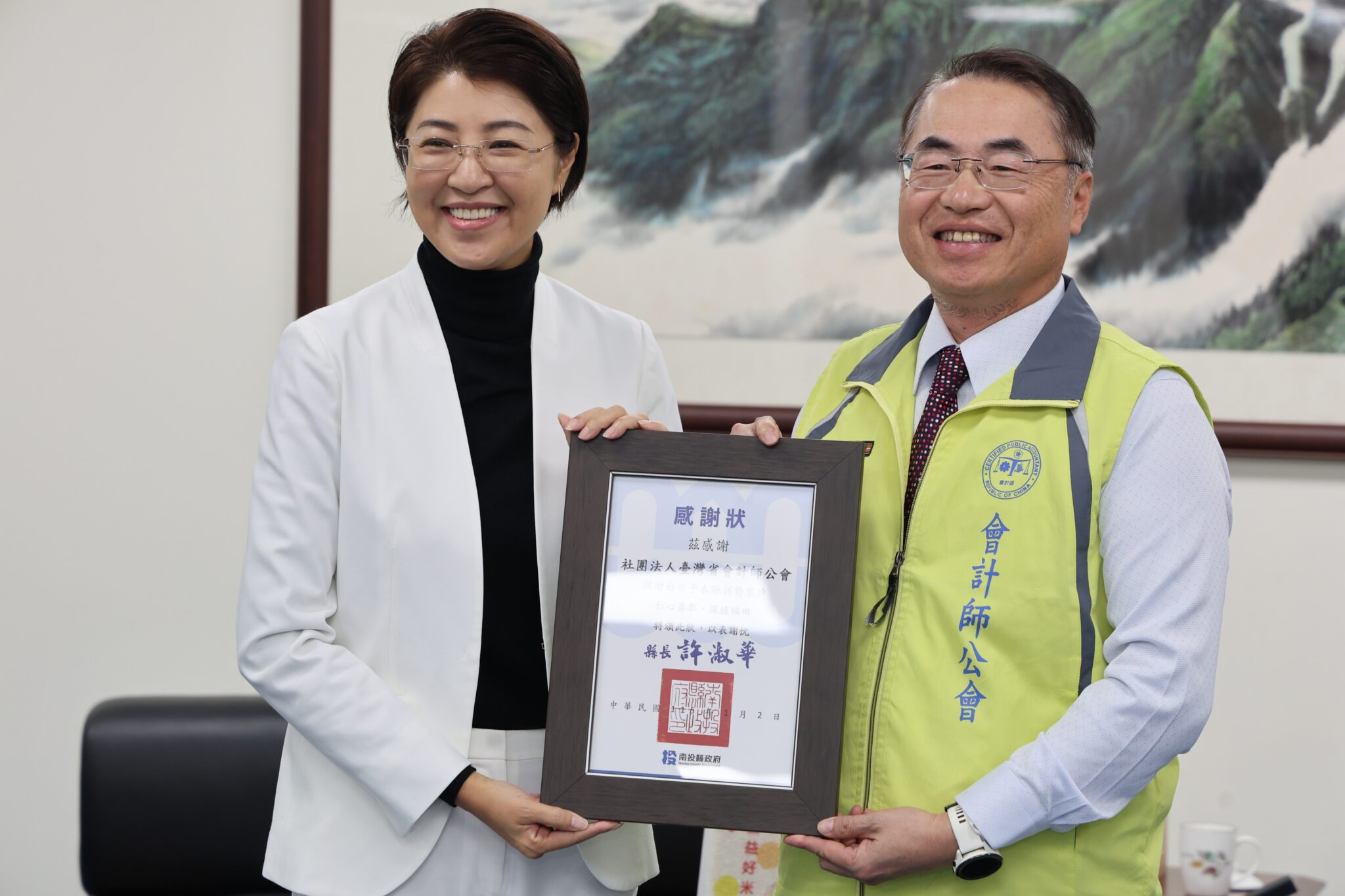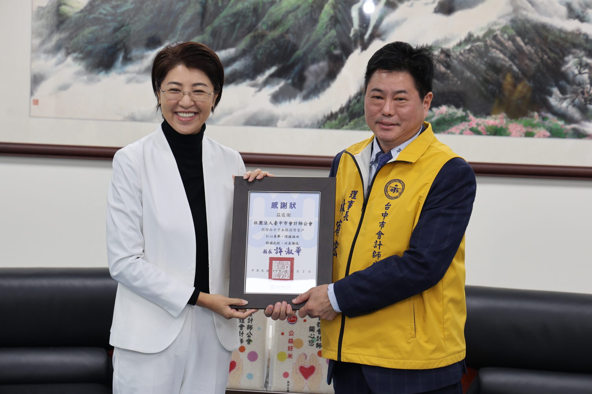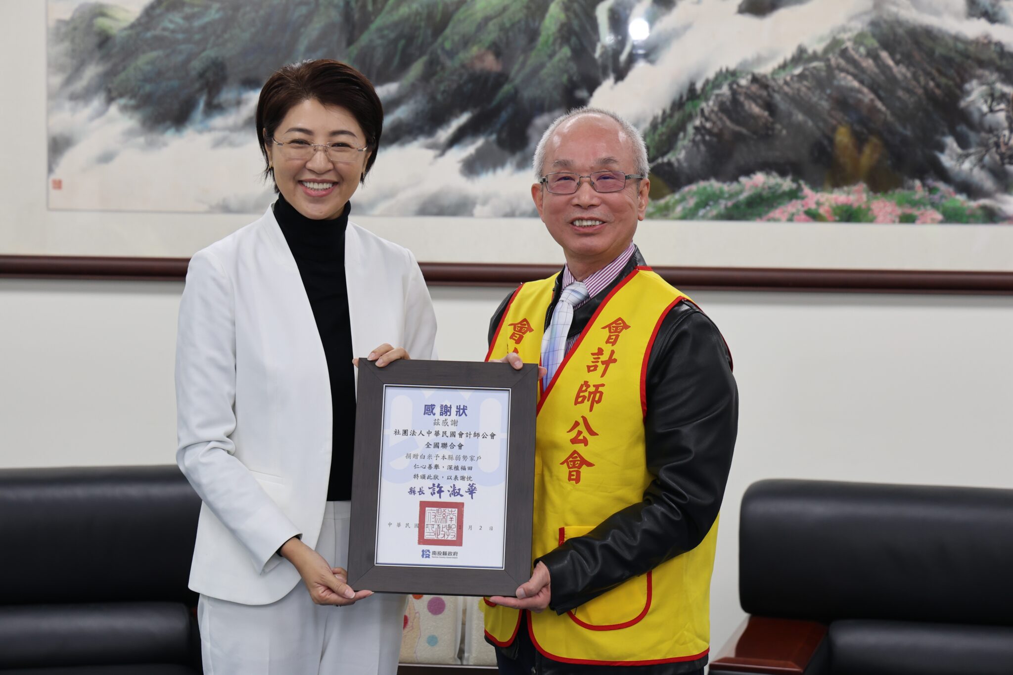 縣長許淑華代表受贈並回贈感謝狀,感謝會計師公會連續這麼多年以實際行動支持南投,值此寒冬之際,這批雪中送炭的白米,將透過縣內食物銀行體系,趕在農曆年前送到需要的家庭手中。
