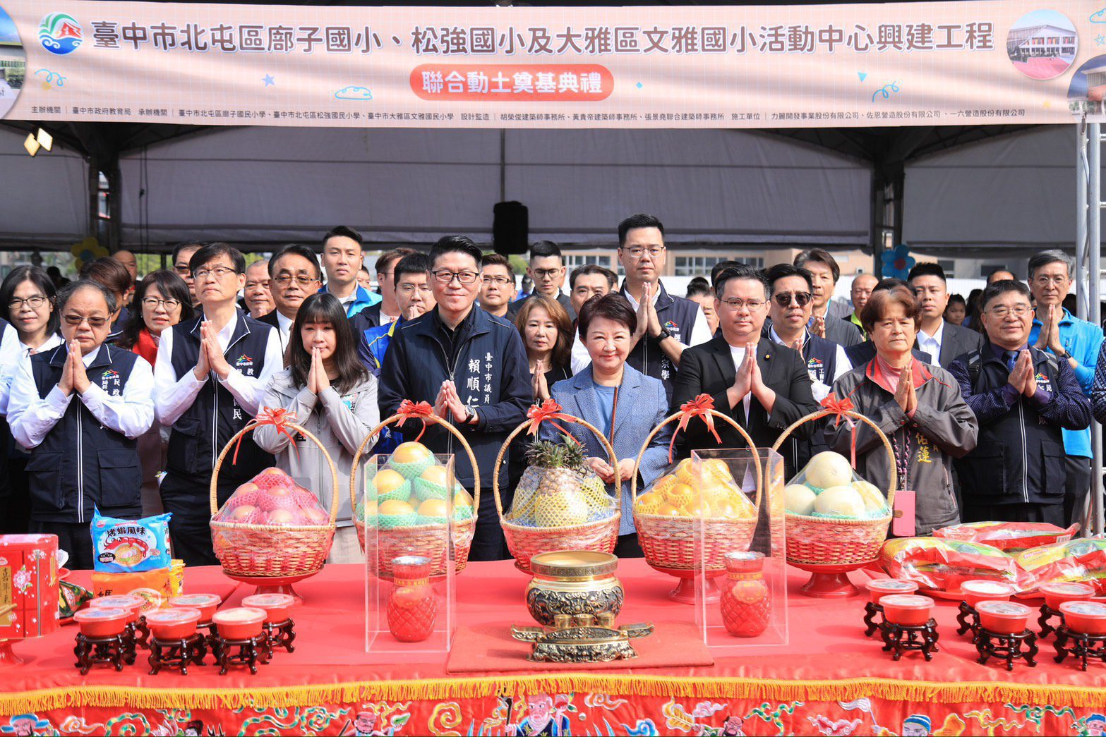 台中市獲評比為全國最幸福城市,也是最關心下一代教育的城市,市府教育局的「給孩子一個禮堂計畫」加速進行中,北屯區廍子國小、松強國小暨大雅區文雅國小活動中心今(10)日動土,在廍子國小舉辦聯合動土典禮,總經費3億多元由市府全額負擔。市長盧秀燕出席典禮,感謝台中市議會與各界民代的支持,讓孩子順利圓夢。