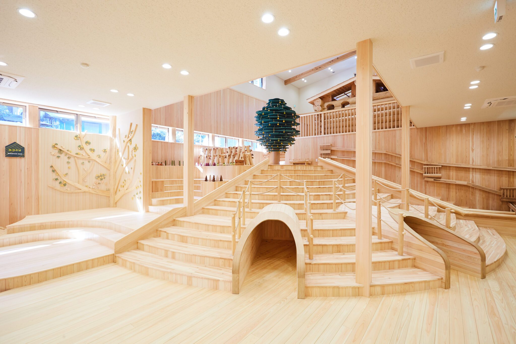 館內外大量使用檜原村當地產的杉木與檜木,木香氤氳的空間,讓訪客一踏入便能感受到林木的溫潤氣息。所有遊具與玩具皆為木製,甚至將五線譜黑板或校園裡的銀杏樹作為柱子再利用,每處細節都蘊含著小學時代的記憶。