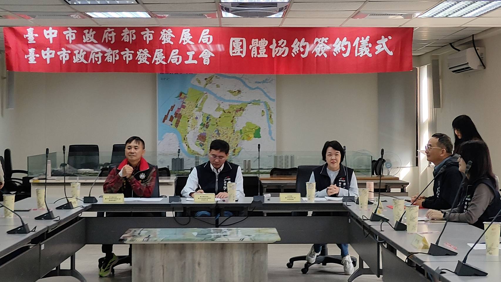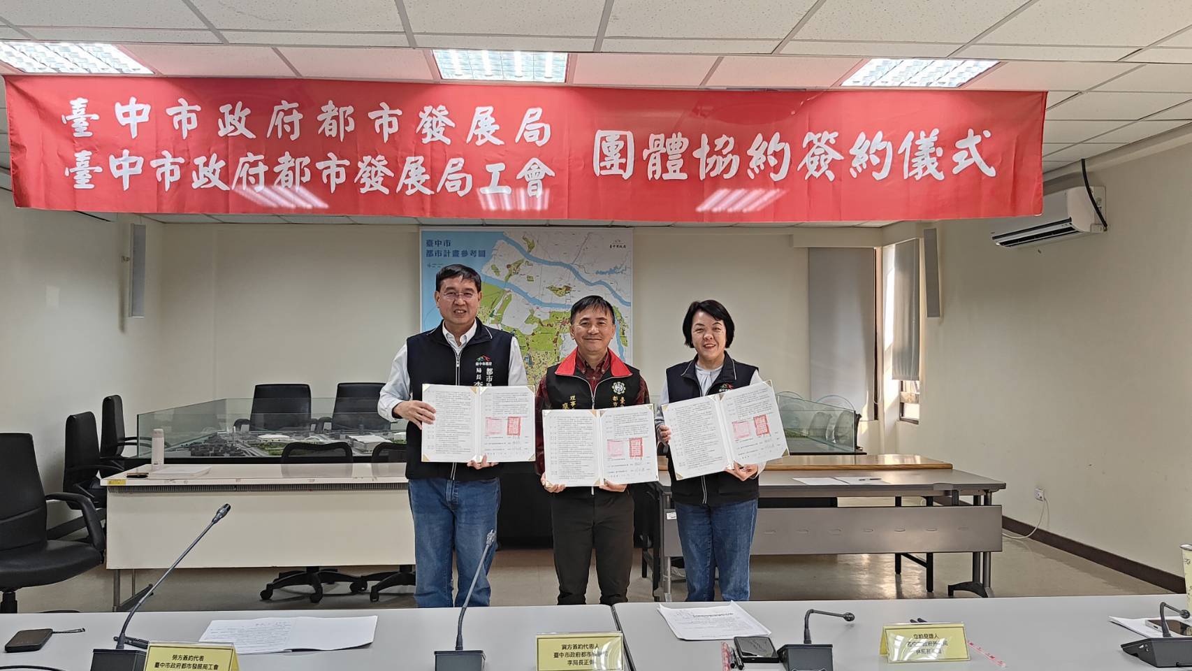 台中市政府都市發展局與其工會於今(5)日舉行團體協約簽約儀式,由局長李正偉與工會理事長廖國光代表簽署;勞工局長林淑媛及中市產業總工會理事長黃文峯到場見證,肯定工會長期推動勞資和諧之努力。