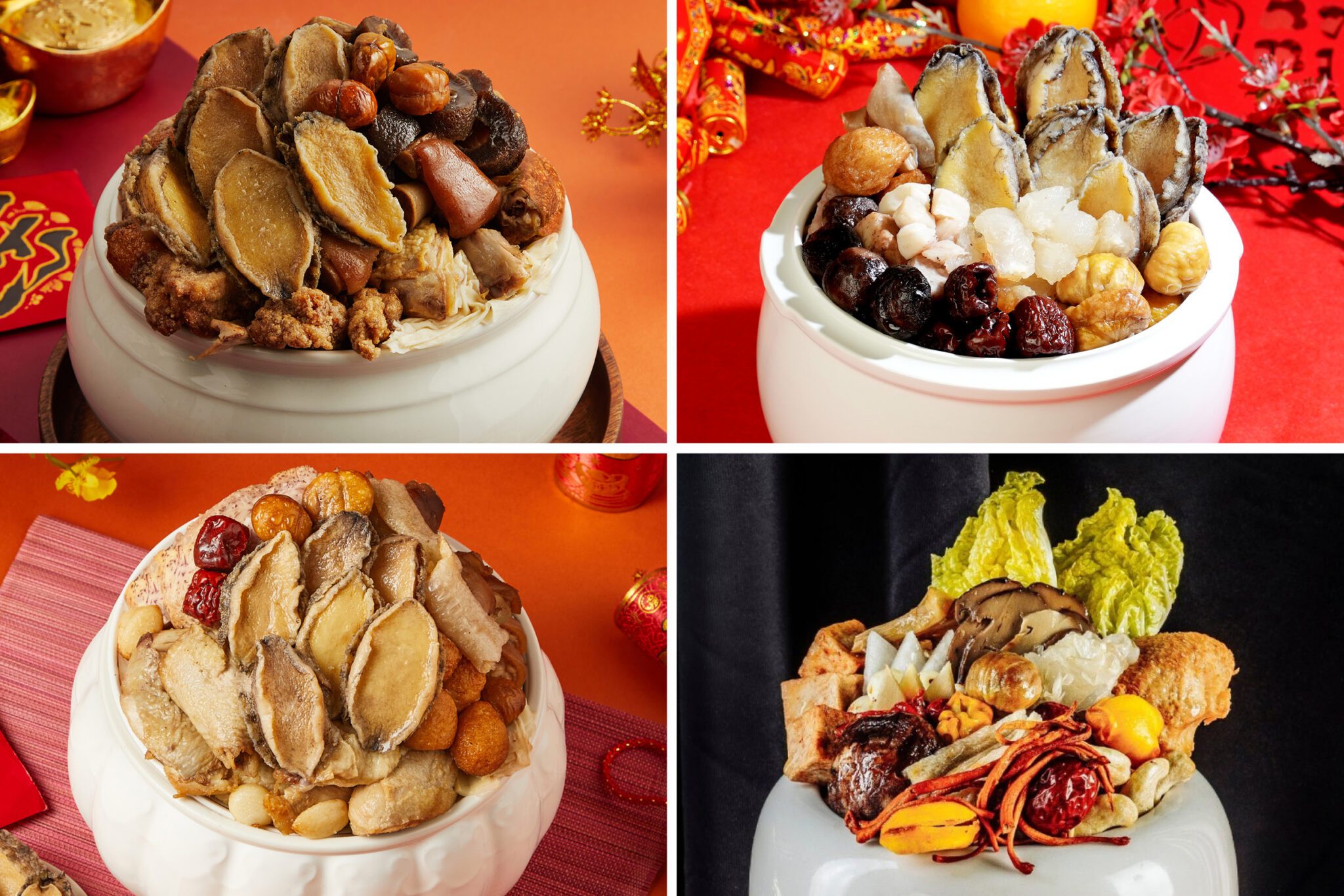 台南遠東香格里拉飯店的「鮑魚干貝佛跳牆」層次豐富,色香味兼具。連年獲米其林推薦的錦霞樓,今年與「胡同」聯名推出「頂級鮑魚烏蔘佛跳牆」,湯頭濃郁、食材澎湃。陽明春天可在網路上單購「蔬食佛跳牆」作為主桌亮點,讓素食者與葷食者同桌共享。這些佛跳牆可以單買,也有各種組合,小食大宴任君選擇。