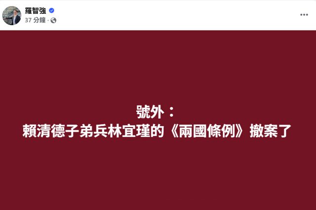 綜合報導/賴系民進黨籍立委林宜瑾3日表態提案將《兩岸人民關係條例》法律名稱改為《台灣與中華人民共和國人民關係條例》,並刪除條文中“國家統一”相關文字,5日下午傳出已撤案。網友也留言表示,“嚇到了嗎”、“我以為會撐久一點”、“習慣了,又不是第一次”。林宜瑾辦公室則表示,案子還在連署階段,沒有撤案的問題。 林宜瑾該提案獲20多名綠委連署,陸委會3日未直接表態,僅回應“兩岸條例具高度政治敏感性,相關修正都必須獲得社會多數共識”。 林宜瑾3日表示,面對藍白擋軍事預算、擋國家總預算、擋國安法案,自己深深感受到,身為民進黨立委有比起以往更強的義務,運用立法及修法職權,反侵略、反殖民、反台海問題內政化。也因此在藍白兩黨攜手摀住台灣人的嘴,不讓他們對中國大陸軍演發出不平之鳴的同一時間,自己在立法院內來回奔走,親自邀請委員同僚們連署對《台灣地區與大陸地區人民關係條例》(兩岸人民關係條例)的修法提案。 ![]() 林宜瑾指出,自己除了提案將法律名稱改為《台灣與中華人民共和國人民關係條例》外,也刪除原條文中“國家統一前”以及透過“地區”相稱“兩國”領土之用語,使各法條進一步符合於基本事實。 羅智強今天下午在臉書發文透露,林宜瑾修正《兩岸人民關係條例》的提案已撤案,相關貼文一出立刻引來大批網友留言,表示,“習慣了,又不是第一次”、“連滾帶爬的撤案了”、“太失望了”、“難得大家都挺他們黨欸”、“我以為會撐久一點”、“這麼快?才幾小時”、“嚇到了嗎”。
