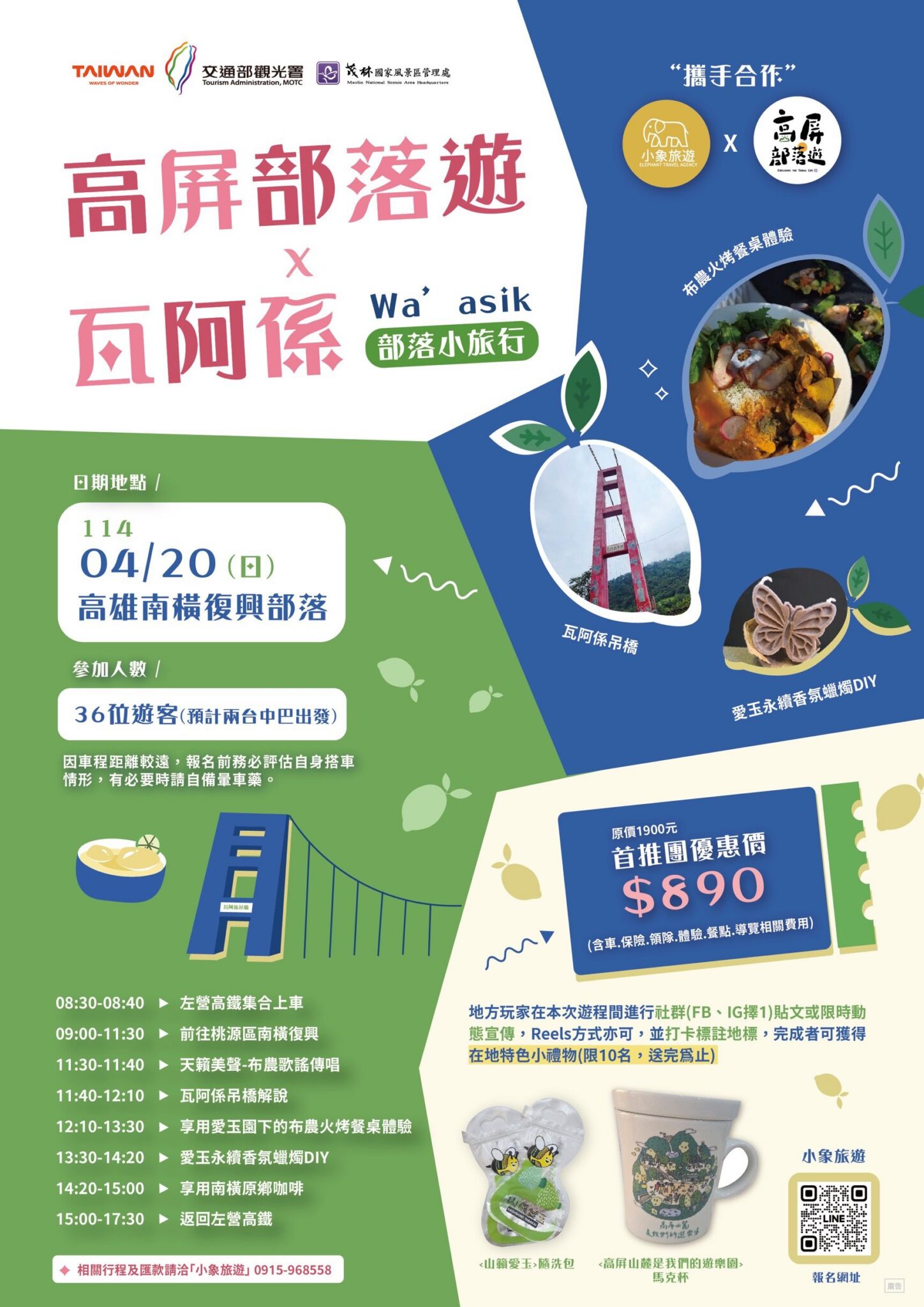 復興部落慢食職人營與瓦阿係小旅行優惠推廣中,歡迎民眾前來一同感受南橫復興的嶄新生命力,名額有限,把握時間手刀報名!更多活動資訊可至茂管處官網「茂林新訊-活動年曆」(https://www.maolin-nsa.gov.tw)查詢,或追蹤 Facebook 粉絲專頁「Fun心遊茂林(茂林國家風景區)」(https://www.facebook.com/Fun.Maolin/)、「高屏部落遊」(https://www.facebook.com/exploretribelife)獲得最新活動資訊!