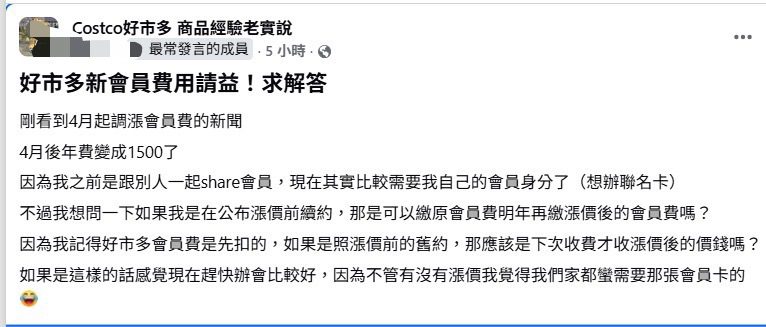 有新會員在臉書社團「Costco好市多 商品經驗老實說」表示,看到4月起調漲會員費的新聞,由 1350元調為1500元,先前跟別人一起share會員,現在自己想辦聯名卡,若能在公布漲價前續約可繳原會員費,得趕快辦會員才是。