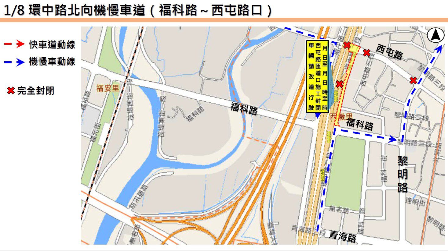 1月11日(週日)20時至1月12日(周一)8時:環中路與西屯路、福科路、青海路口。