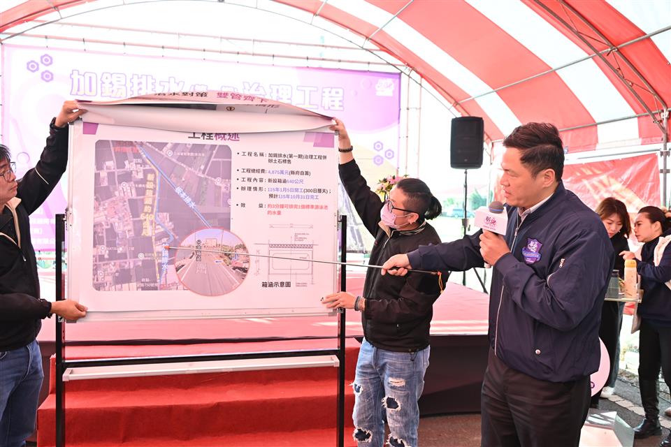 水資處表示,加錫排水(第一期)治理工程是地方期盼已久的重要建設,這次工程總經費為4,875萬元,全額由縣府自籌辦理,範圍自正興巷與錫安路746巷交會處(加錫排水0k+564)往北,至板本排水陝西橋上游,新設箱涵約640公尺,透過箱涵分流的方式,增加排水系統的通洪能力,將能改善長期困擾地方的淹水問題。縣府團隊也將持續爭取經費,針對易淹水地區逐步辦理改善工程,避免鄉親免受淹水之苦。