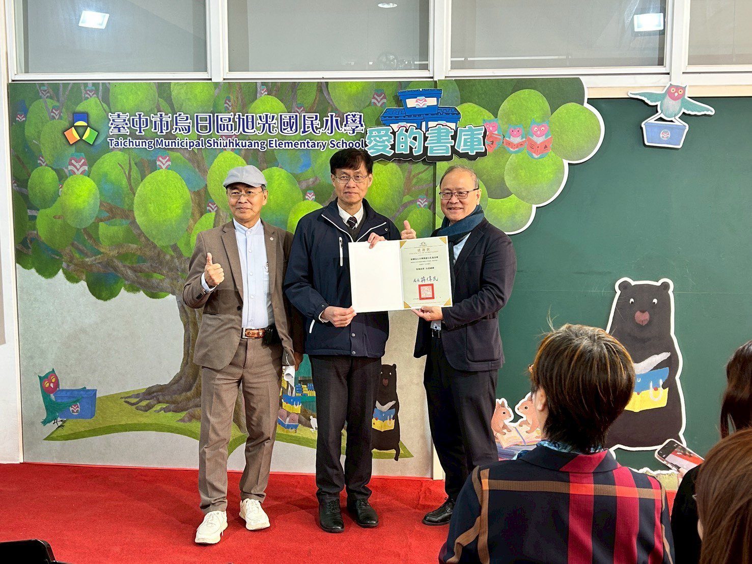 台中市烏日區旭光國小今(7)日舉行「愛的書庫」揭牌儀式,正式啟用台中市第33座一般圖書「愛的書庫」。台中市政府教育局長蔣偉民到場頒發感謝狀,感謝財團法人台灣閱讀文化基金會、永慶不動產七期河南市政店、永慶不動產好市多百富店、300C2區台中縣成功獅子會,以及協助書箱載運的新竹物流股份有限公司攜手促成,共同為孩子打造更豐富的閱讀環境,讓閱讀成為開啟世界的重要力量。