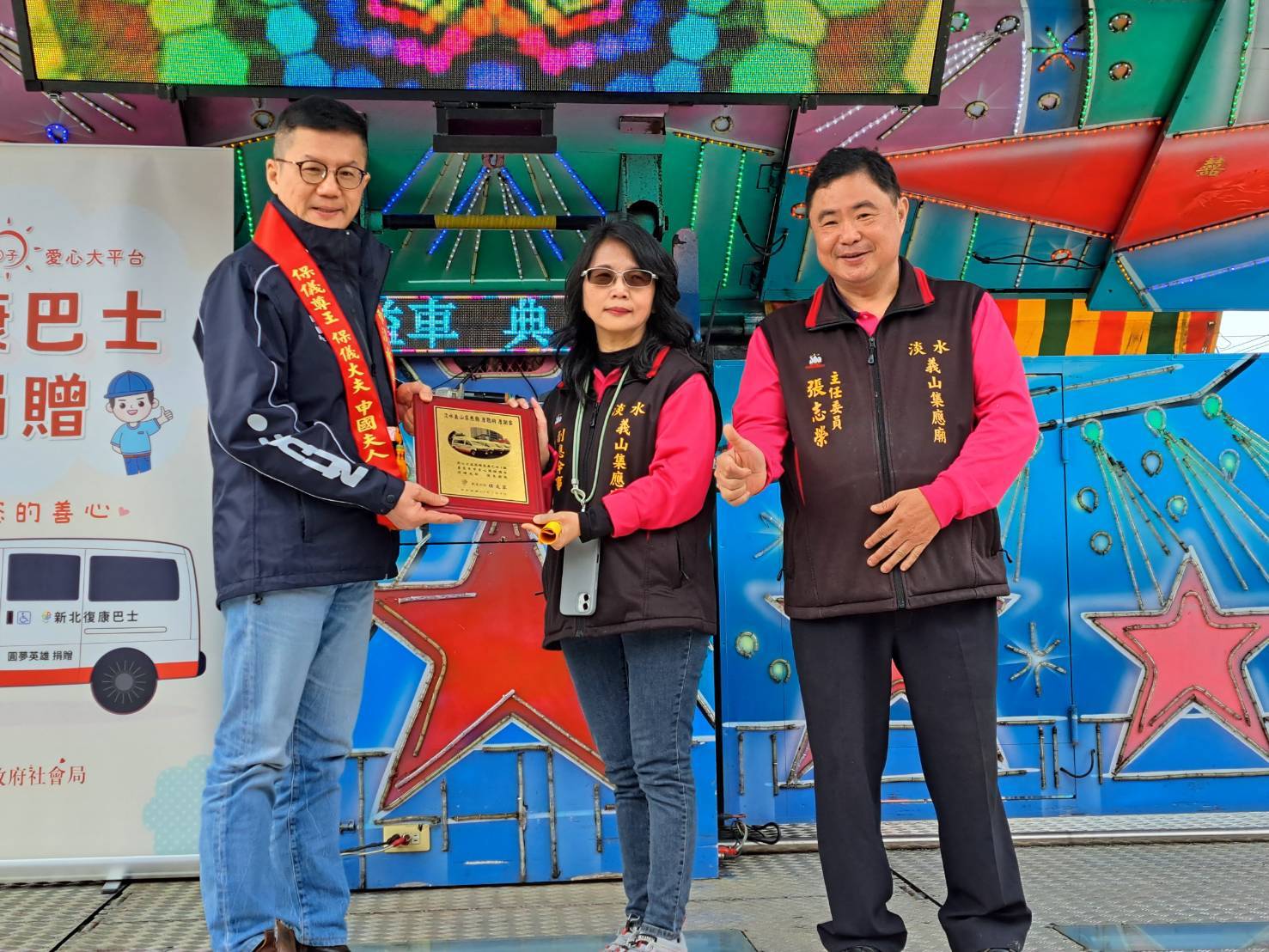 淡水義山集應廟今(8)日舉辦安座52周年慶,志工詹淑媚再度以廟方及父母名義,捐贈一輛雙乘坐位復康巴士給新北市,由市府副秘書長張其強代表侯友宜市長受贈。詹淑媚表示,父母有養育之恩,且生前樂善好施,熱心公益;而集應廟保儀尊王尪公祖有許多顯化在她身上,讓她逢凶化吉,因此特地藉由廟慶捐贈。詹淑媚也曾以廟方名義捐贈1輛救護車給馬偕醫院,捐給新北市的復康巴士則累計達4輛。