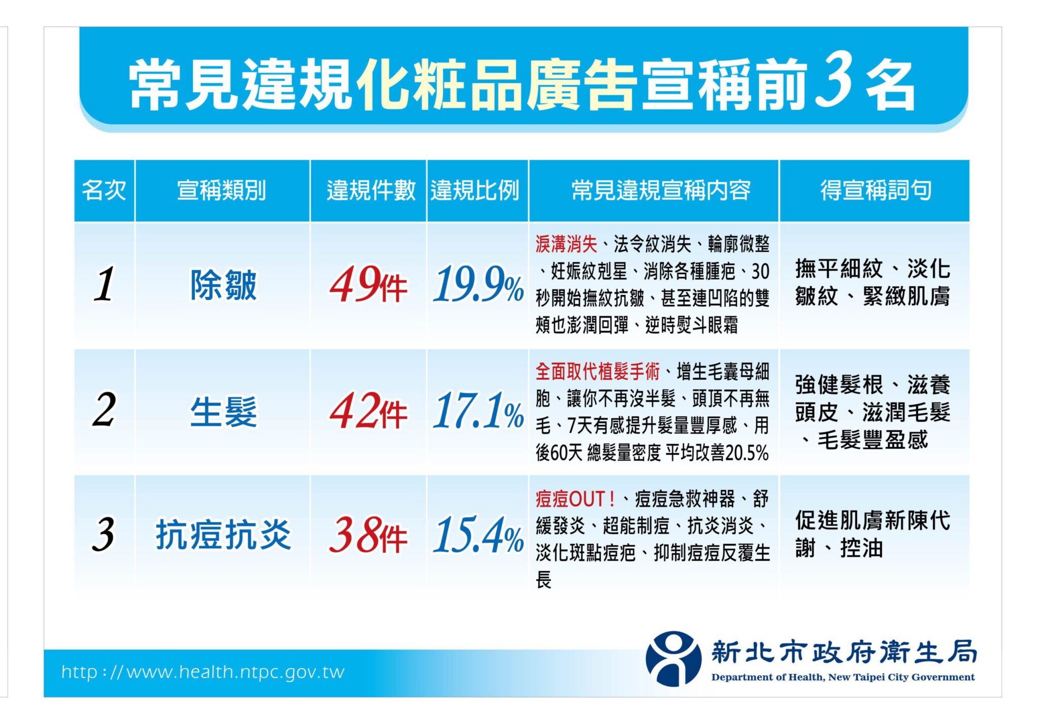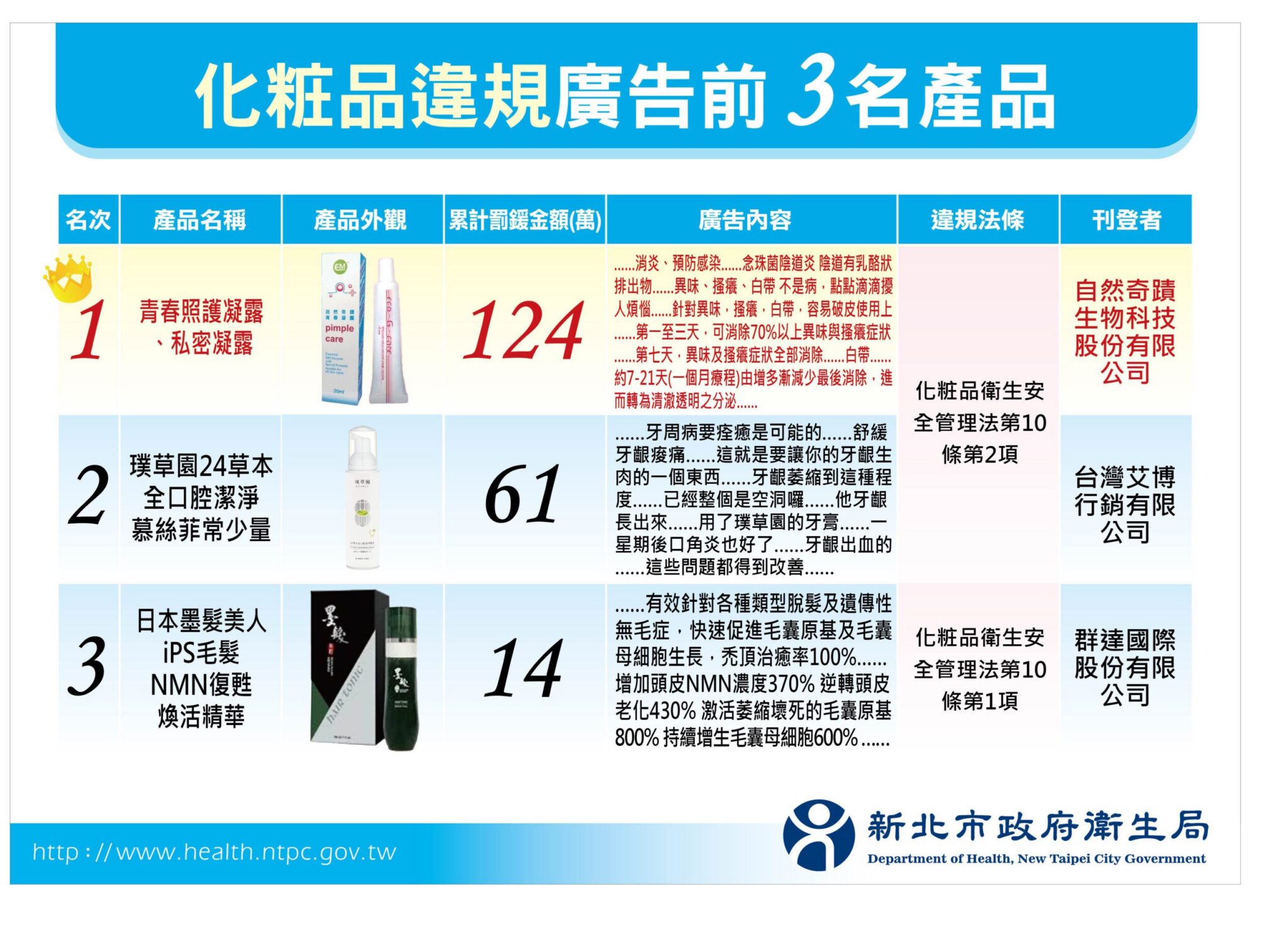 化粧品廣告以「青春照護凝露、私密凝露」等系列產品累計罰鍰最高,自然奇蹟生物科技股份有限公司於網路誆稱「消炎、預防感染」、「白帶約7-21天(一個月療程)由增多漸減少最後消除」等療效,嚴重誤導消費者,遭裁罰124萬元,其次為「璞草園24草本全口腔潔淨慕絲菲常少量」,台灣艾博行銷有限公司於購物頻道誆稱「用了璞草園的牙膏,一星期後口角炎也好了」等消炎療效,遭裁罰61萬元。第3名為「日本墨髮美人iPS毛髮NMN復甦煥活精華」,群達國際股份有限公司於購物頻道誆稱「逆轉頭皮老化430 % 激活萎縮壞死的毛囊原基800 % 持續增生毛囊母細胞600 %」等非化粧品所能達成功效,遭裁罰14萬元。