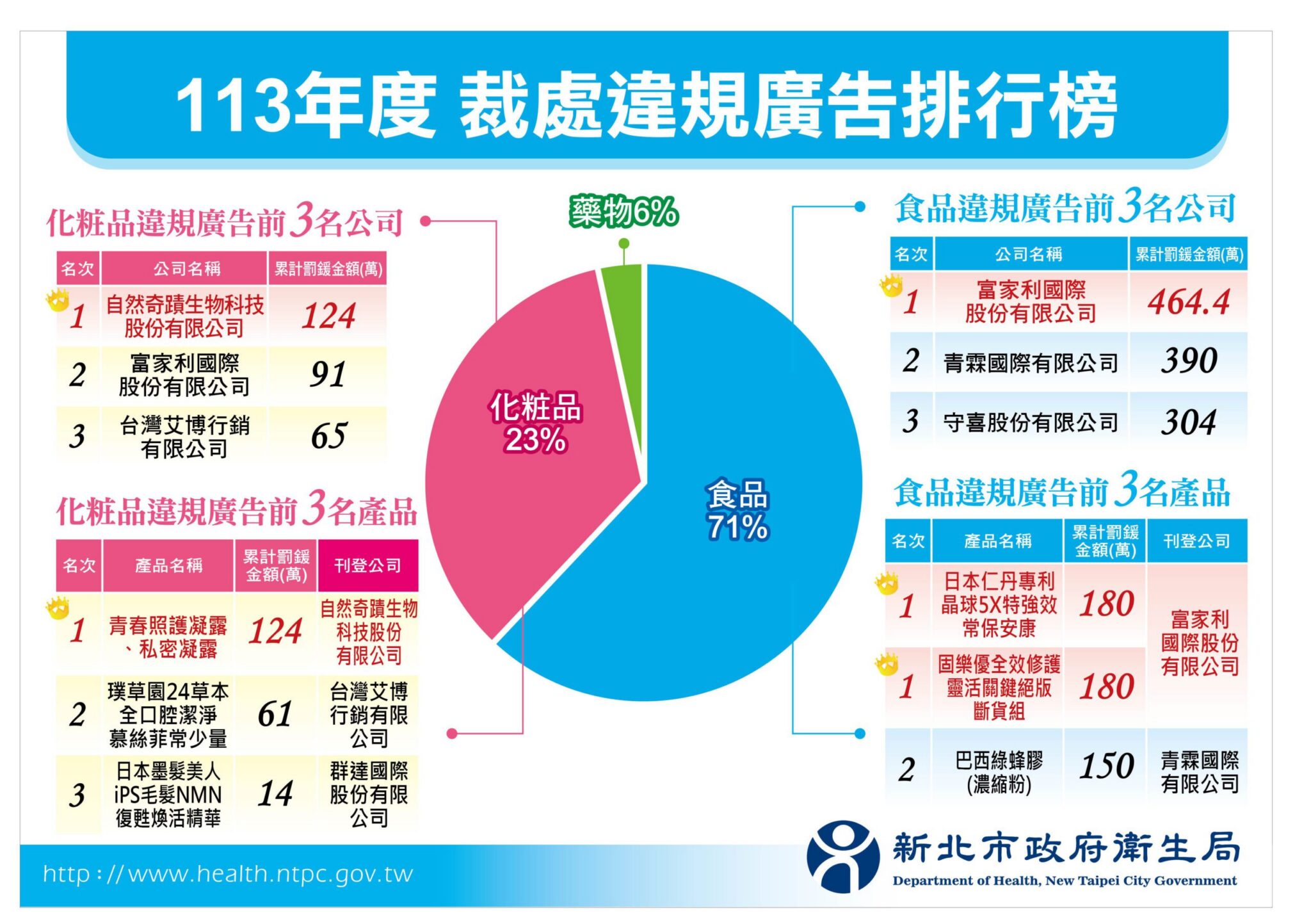 化粧品廣告以「青春照護凝露、私密凝露」等系列產品累計罰鍰最高,自然奇蹟生物科技股份有限公司於網路誆稱「消炎、預防感染」、「白帶約7-21天(一個月療程)由增多漸減少最後消除」等療效,嚴重誤導消費者,遭裁罰124萬元,其次為「璞草園24草本全口腔潔淨慕絲菲常少量」,台灣艾博行銷有限公司於購物頻道誆稱「用了璞草園的牙膏,一星期後口角炎也好了」等消炎療效,遭裁罰61萬元。第3名為「日本墨髮美人iPS毛髮NMN復甦煥活精華」,群達國際股份有限公司於購物頻道誆稱「逆轉頭皮老化430 % 激活萎縮壞死的毛囊原基800 % 持續增生毛囊母細胞600 %」等非化粧品所能達成功效,遭裁罰14萬元。