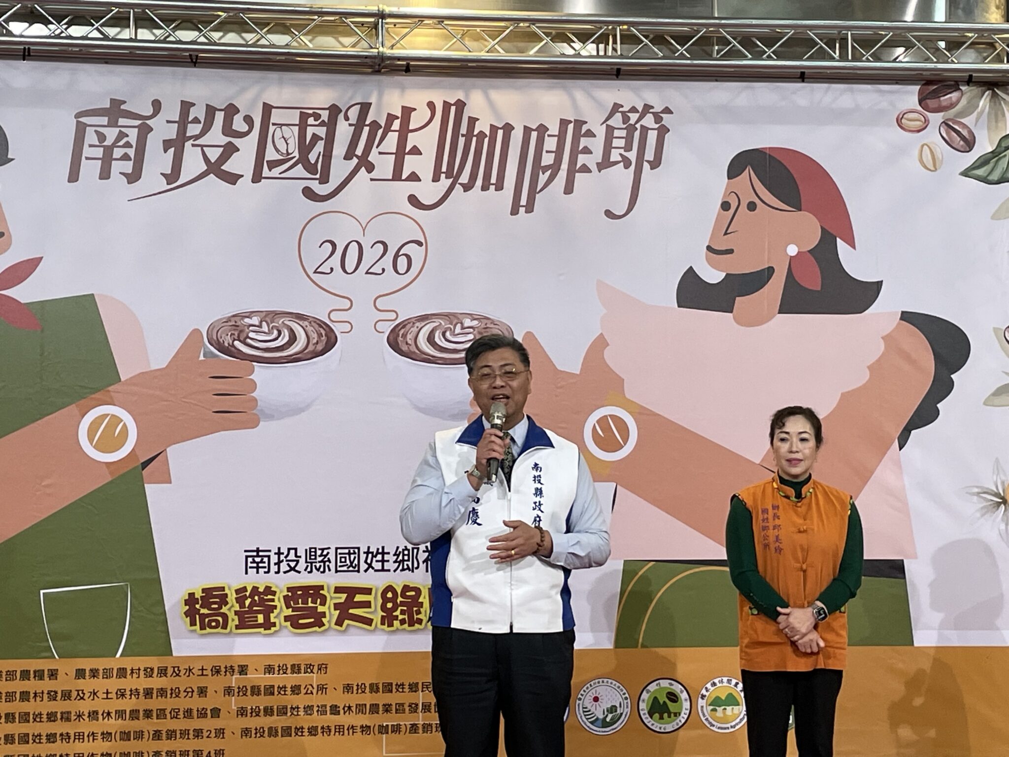 今(8)日上午縣府及國姓鄉公所在縣府一樓大廳聯合舉行「2026南投國姓咖啡節—橋見咖啡香,客庄好食光」活動記者會,由縣府參議陳瑞慶及國姓鄉長邱美玲邀請與會貴賓一同啟動活動序幕,並宣布2026國姓咖啡節活動於1月24、25日兩天在橋聳雲天綠雕園區盛大登場,精品咖啡任君挑選,優質農產任你選購,還有3千大獎等你拿,歡迎全國民眾呼朋引伴,鬥陣來喝精品咖啡,在陣陣咖啡香氛中暢遊綠雕美景,嚐鮮果,感受客庄好風情。縣議員林儒暘、簡千翔、南投市長張嘉哲、馬文君立委服務處執行長楊樹煌、游顥立委服務處主任江秀春也到場致意。