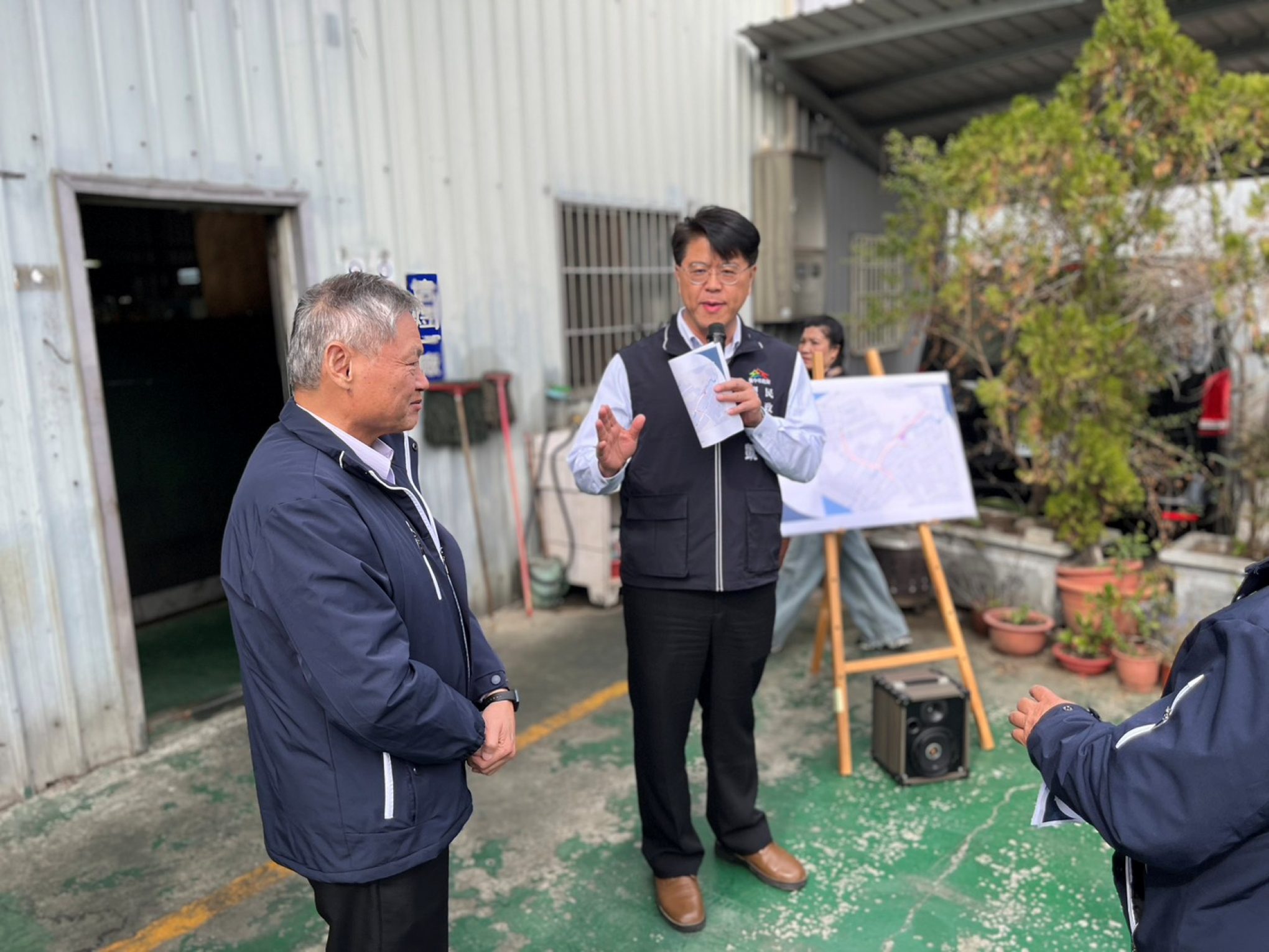 彭副局長(中)偕同大里區長鄭正忠及公所團隊、西湖里長賴加彬等人視察大里區草堤路158巷