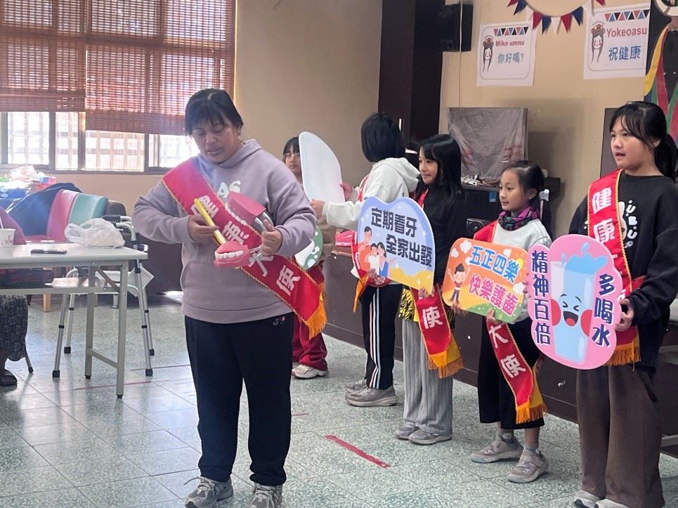 在校內,大使們鏗鏘宣讀活力宣言,展現對健康自主的堅定承諾;志工家長帶領孩子走入部落文健站,孩子們牽起長輩的手,與長者一同跳起「潔牙舞」,互動溫馨且充滿笑聲。志工們也拿出大型牙齒模型,親自示範「貝氏刷牙法」,讓口腔保健觀念以更生動的方式傳遞給部落長者。