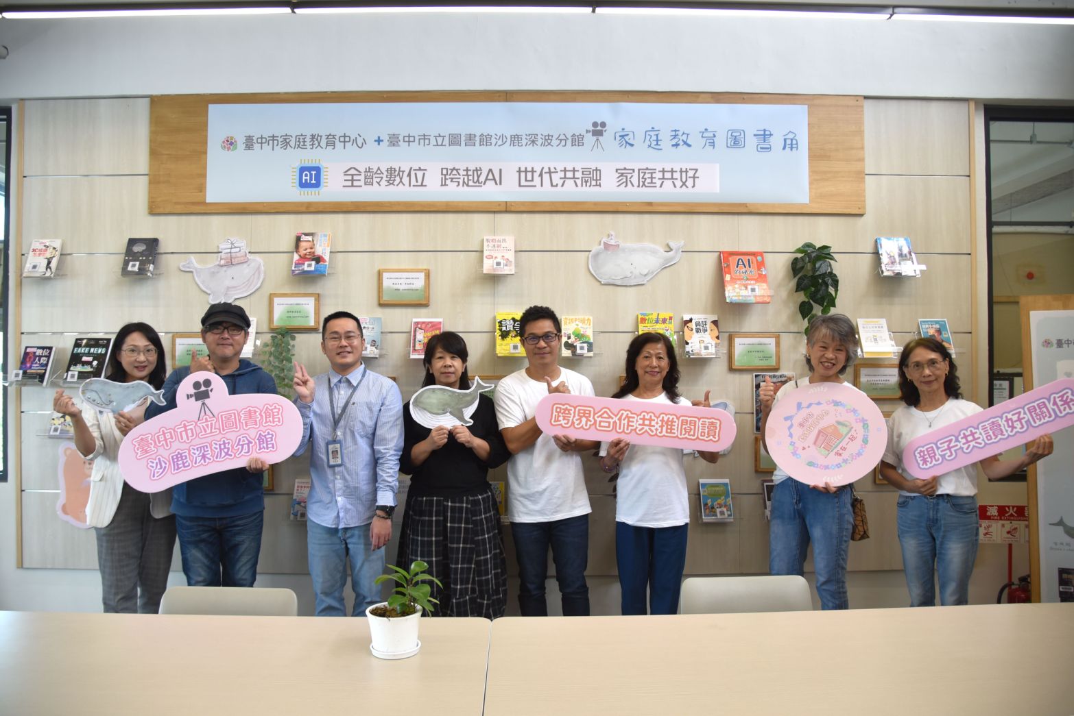 蔣局長也提到,家庭教育中心與沙鹿深波分館於去年全台首創「家庭教育圖書角」,今年再度升級,以數位素養為主軸,精選相關書籍及介紹,並邀請沙鹿在地畫家林庭老師操刀設計主視覺,現場更由弘光科技大學多媒體遊戲發展與應用系劉明昆副教授設計AR互動體驗遊戲,讓市民透過多元管道,深入了解數位世界的各種議題,幫助提升數位識讀能力,確保全家大小都能安全運用科技,迎接未來挑戰。