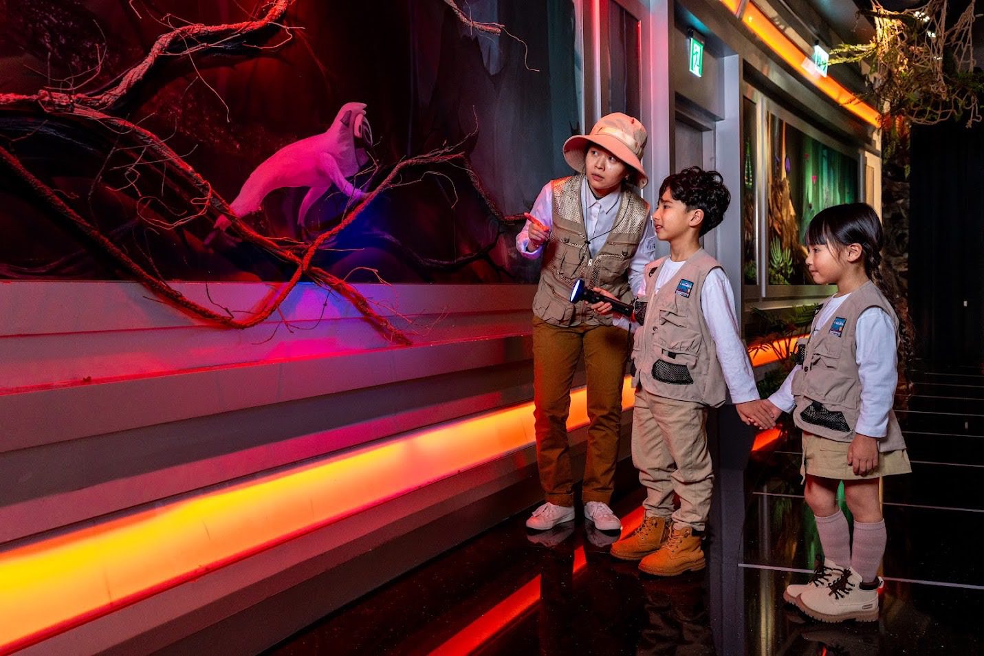 作品同時也將環境保育的概念融入冒險任務中,透過體驗情境,引導孩子理解森林生態所面臨的危機與守護環境的重要性。現場亦設有妖怪圖鑑與臺灣特色地景展覽,將《妖怪森林》動畫電影製作團隊篩選出近200種本土妖怪的田野調查精華,變成互動式展覽,讓家長能陪伴孩子一同探索與討論,共創美好的親子共學時光。
