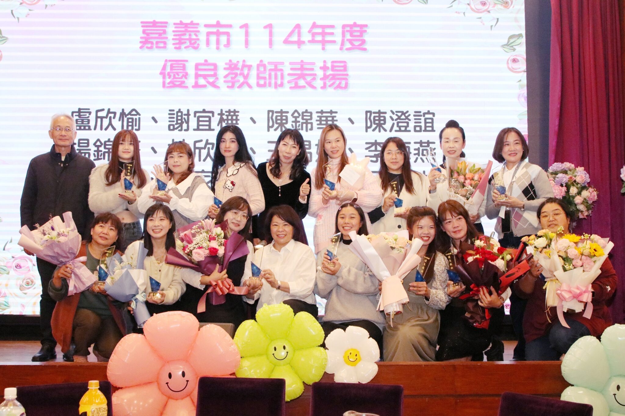 嘉義市幼兒教育學會於昨(9)日晚上於鈺通大飯店,舉行114年優良教師、資深教保服務人員表揚大會,市長黃敏惠出席表彰在幼兒教育領域中表現卓越的私立幼兒園老師。今年共39名資深教保服務人員以及42名優良教師接受表揚,其中年資30年的有2位,服務年資20年的有14位,服務年資10年的有23位。