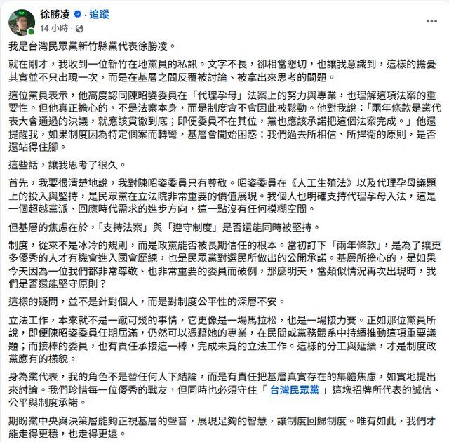 徐勝凌8日晚間於臉書發文表示,自己稍早收到新竹在地黨員私訊,表達高度認同陳昭姿在“代理孕母”法案上的努力與專業,也理解這項法案的重要性,但真正擔心的不是法案本身,而是制度會不會因此被鬆動,該黨員表達“兩年條款是黨代表大會通過的決議,就應該貫徹到底;即便委員不在其位,黨也應該承諾把這個法案完成。”如果制度因為特定個案而轉彎,基層會開始困惑“我們過去所相信、所捍衛的原則,是否還站得住腳”。